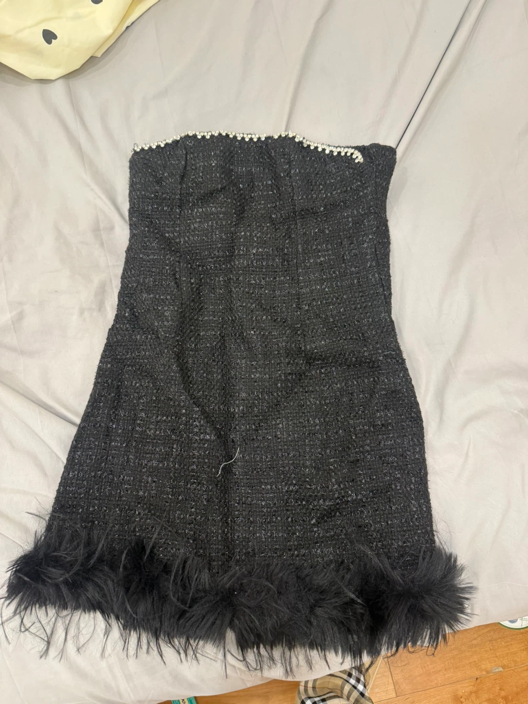Selling a cute black strapless dress with a feather trim! It's in great condition and perfect for a night out or special event