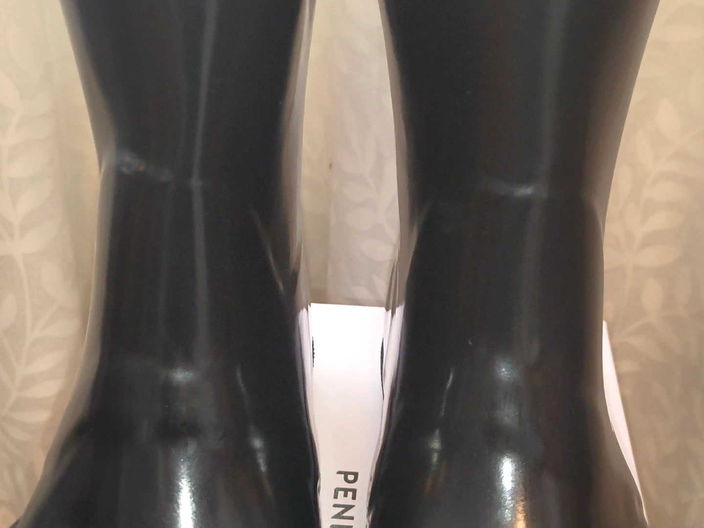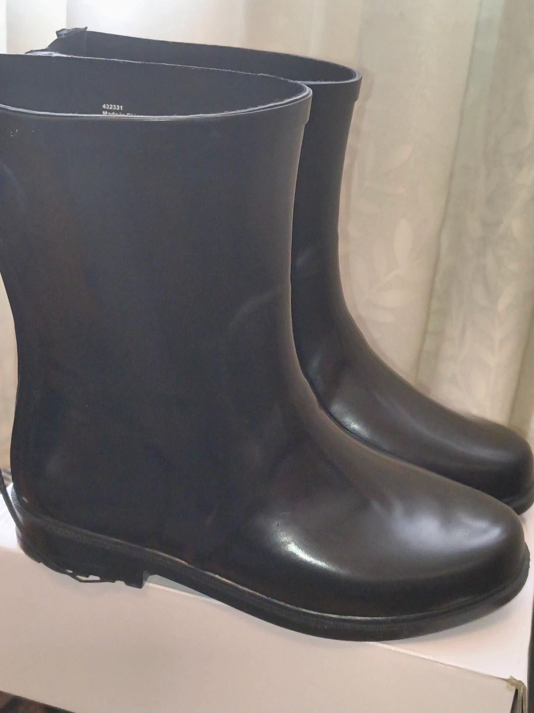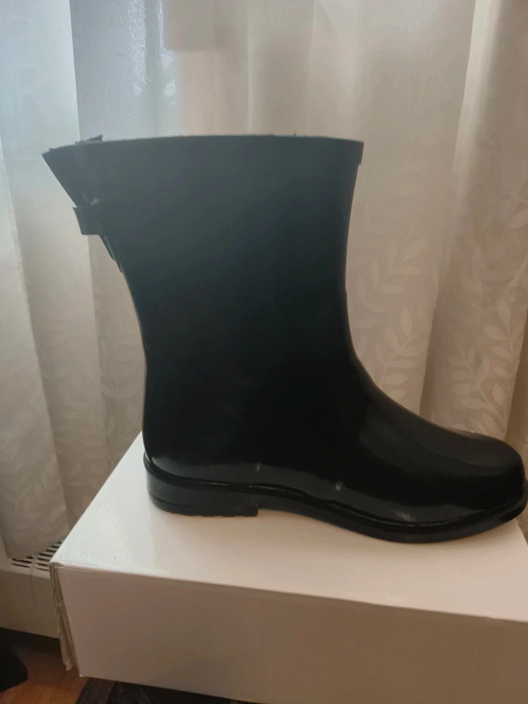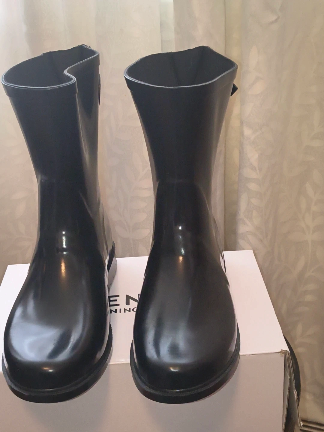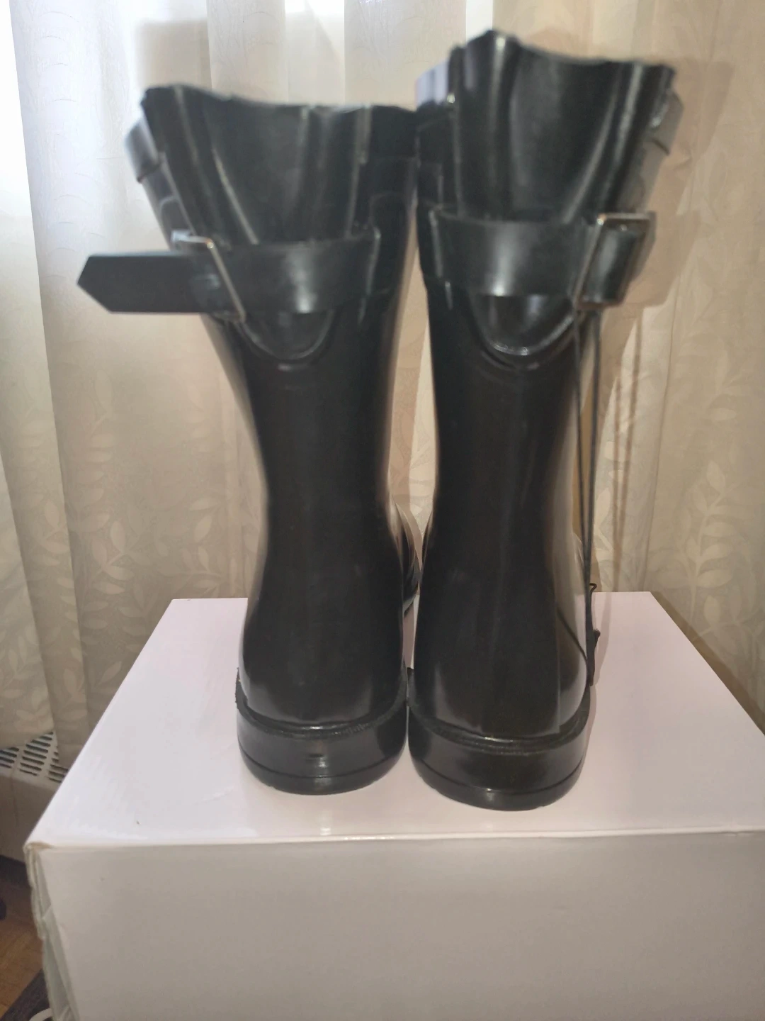 These black rain boots are perfect for keeping your feet dry on wet days. They're made of a durable, waterproof material. A decorative buckle detail is present on the back of each boot. Never worn New