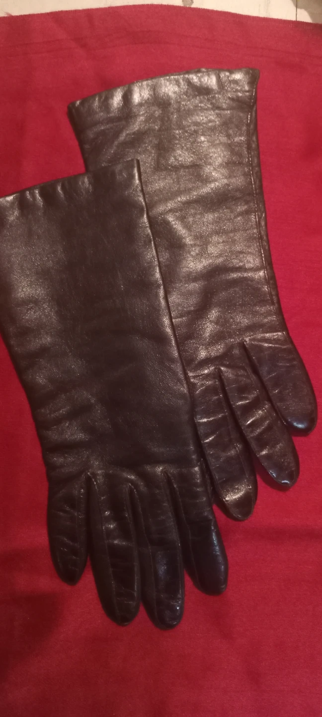 These are a pair of brown leather gloves. The material is genuine leather. They're suitable for keeping your hands warm during cooler weather.
