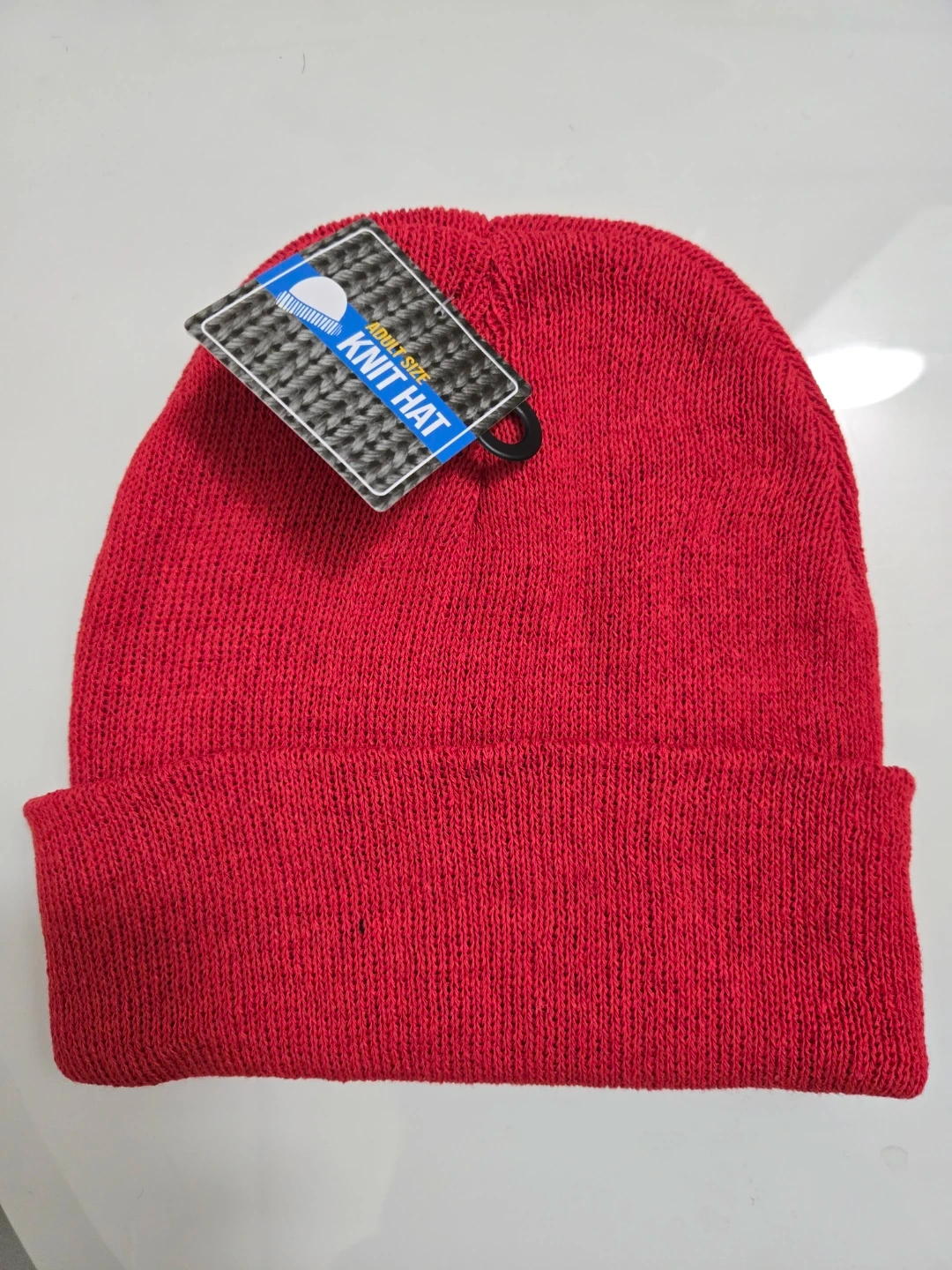 This is a red knit hat for adults. It's made of a soft, stretchy material. This hat is perfect for keeping warm during colder months.