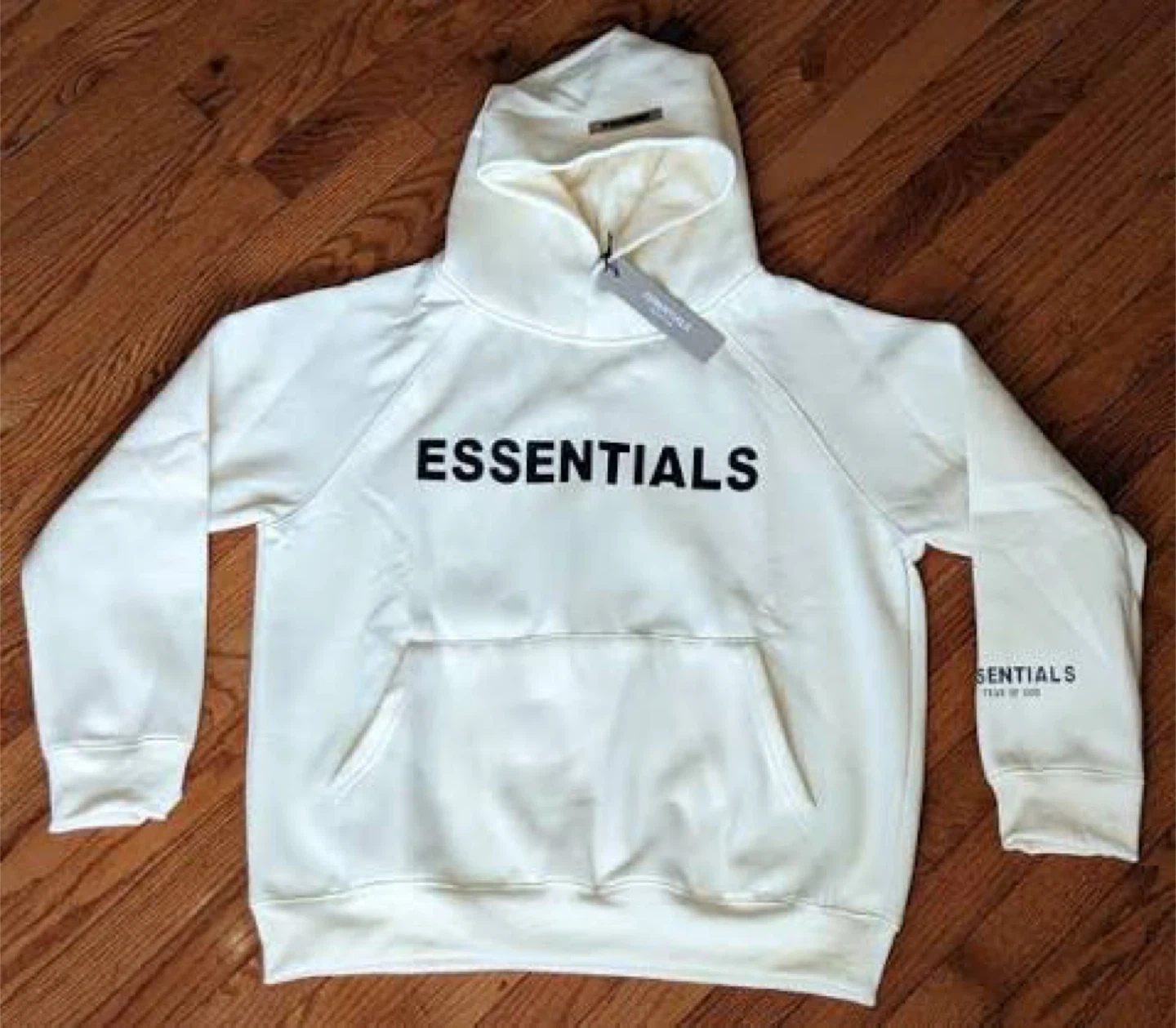 White coloured Fear of God Essentials hoodie with a front kangaroo pocket. It has the Essentials logo printed on the chest and a smaller logo on the sleeve. 100% real, feel free to check as much as you like. Worn once - too big. Brand new