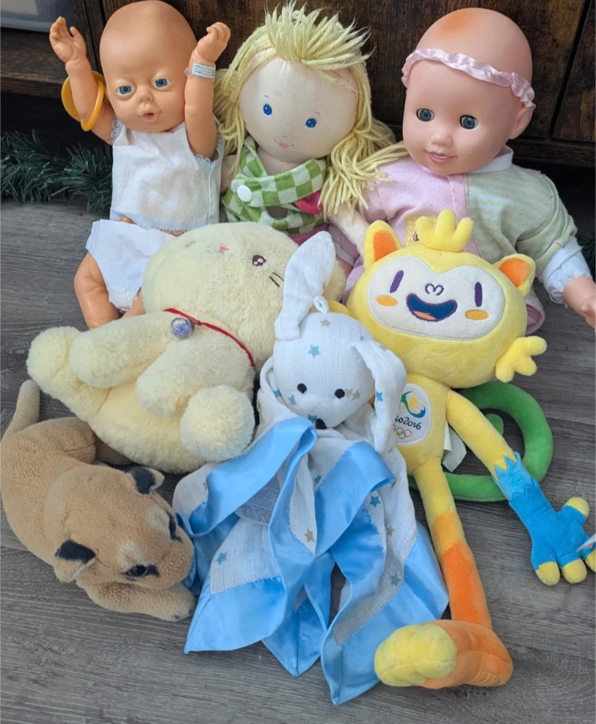 A collection of gently used plush toys and dolls, perfect for a child's playtime or as decorative items. Includes a variety of characters and styles.