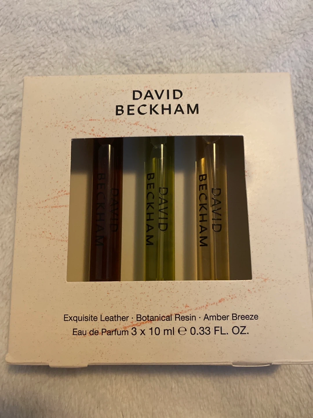 Set of three David Beckham Eau de Parfum fragrances: Exquisite Leather, Botanical Resin, and Amber Breeze. Each bottle is 10 ml. Great for trying out different scents!