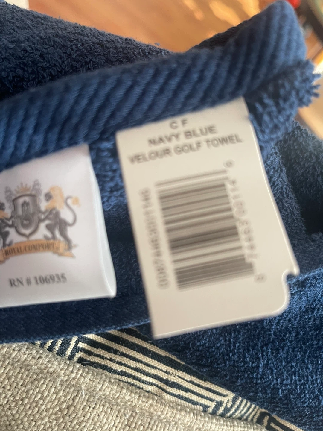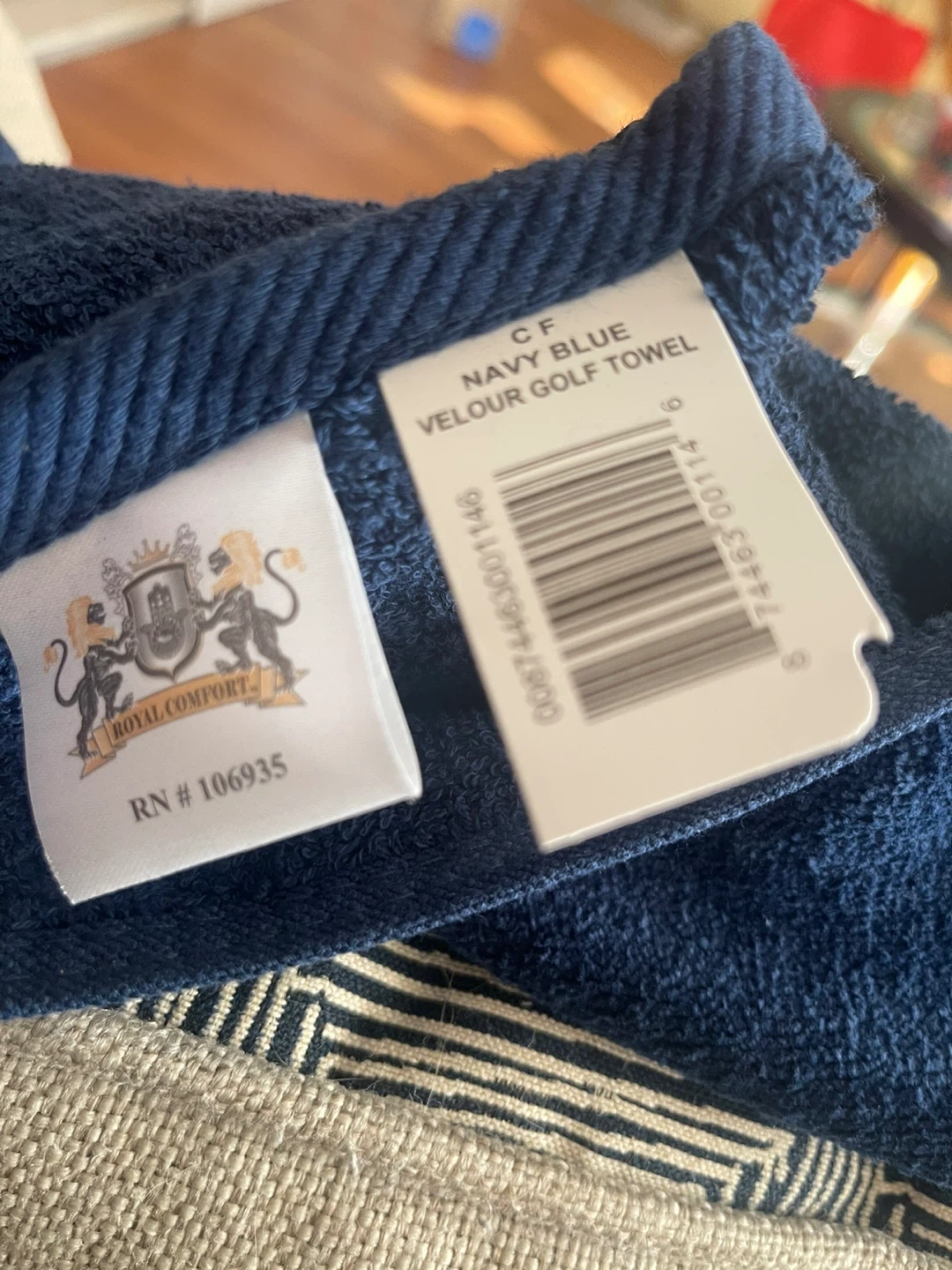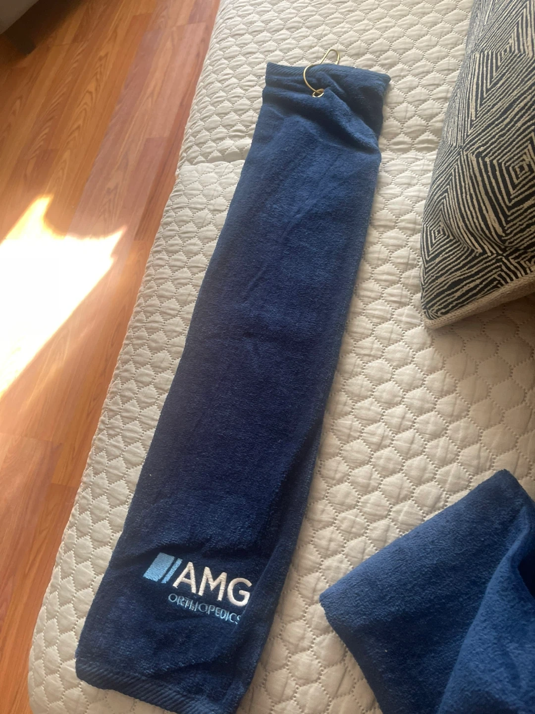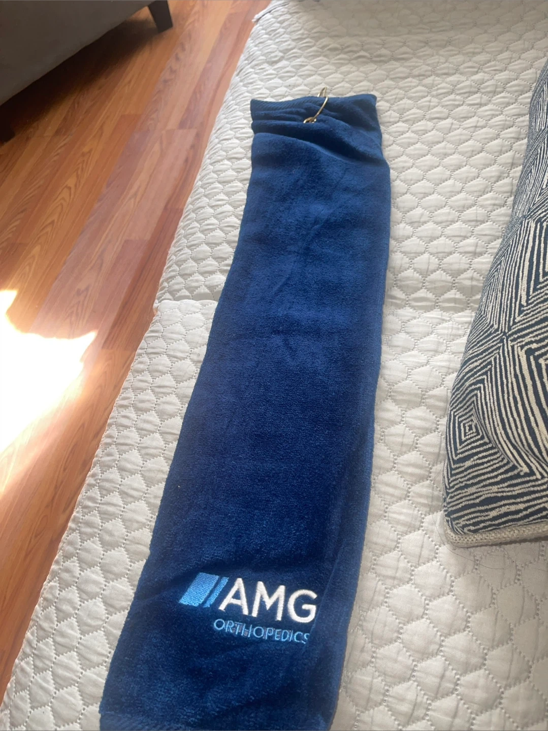 New Blue towel from AMG Orthopedics. It features the brand logo embroidered on the fabric. Includes a hook for easy hanging. Material appears to be terry cloth.