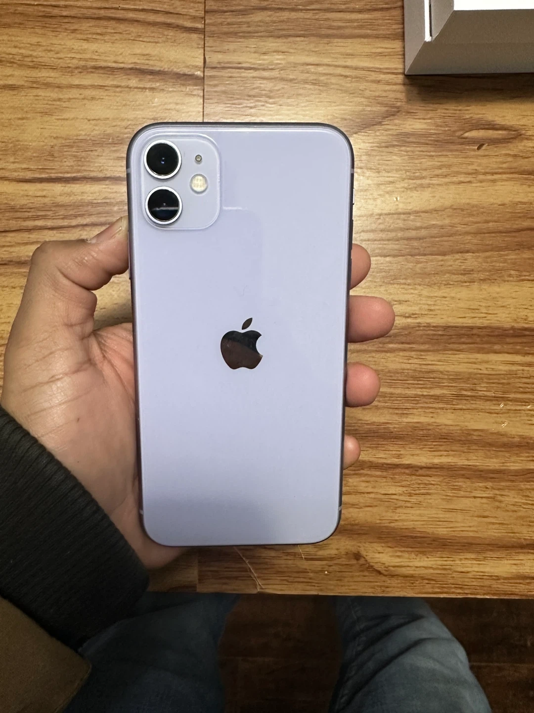 This is an Apple iPhone 11 with 128GB of storage in purple. The battery health is at 76%. It's running iOS version 26.2. The phone comes with its original box.