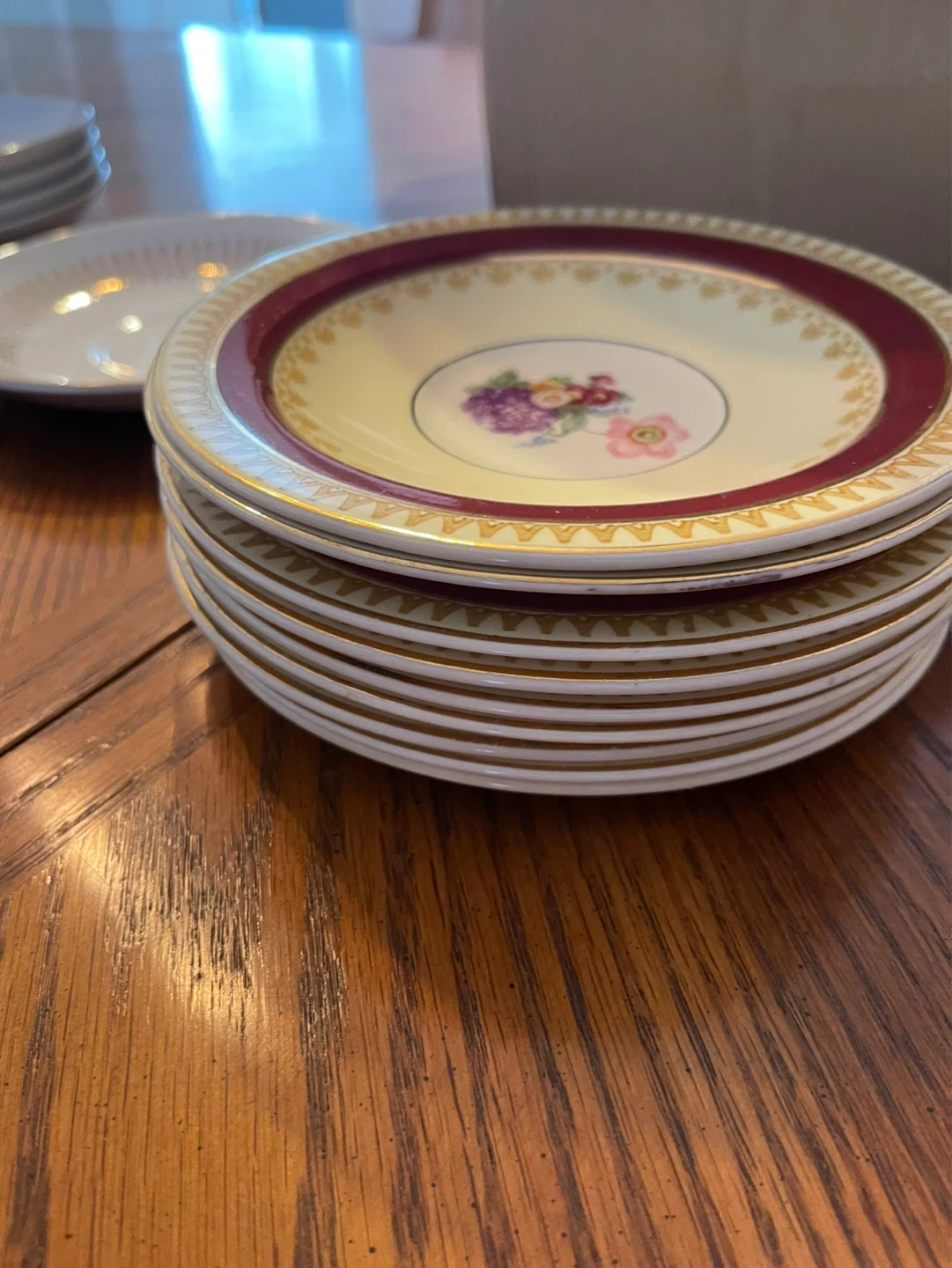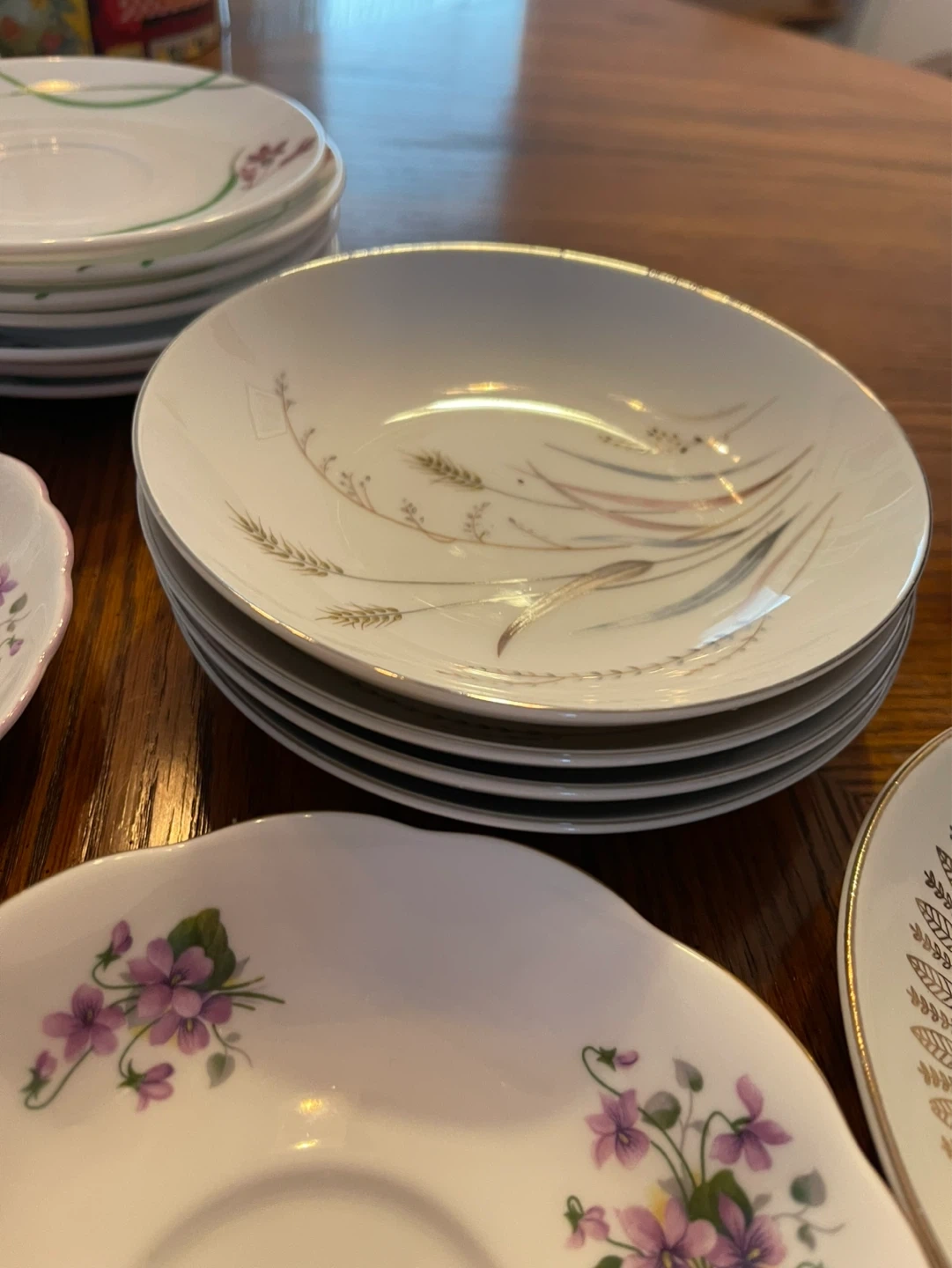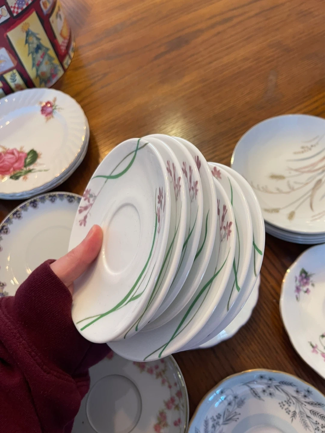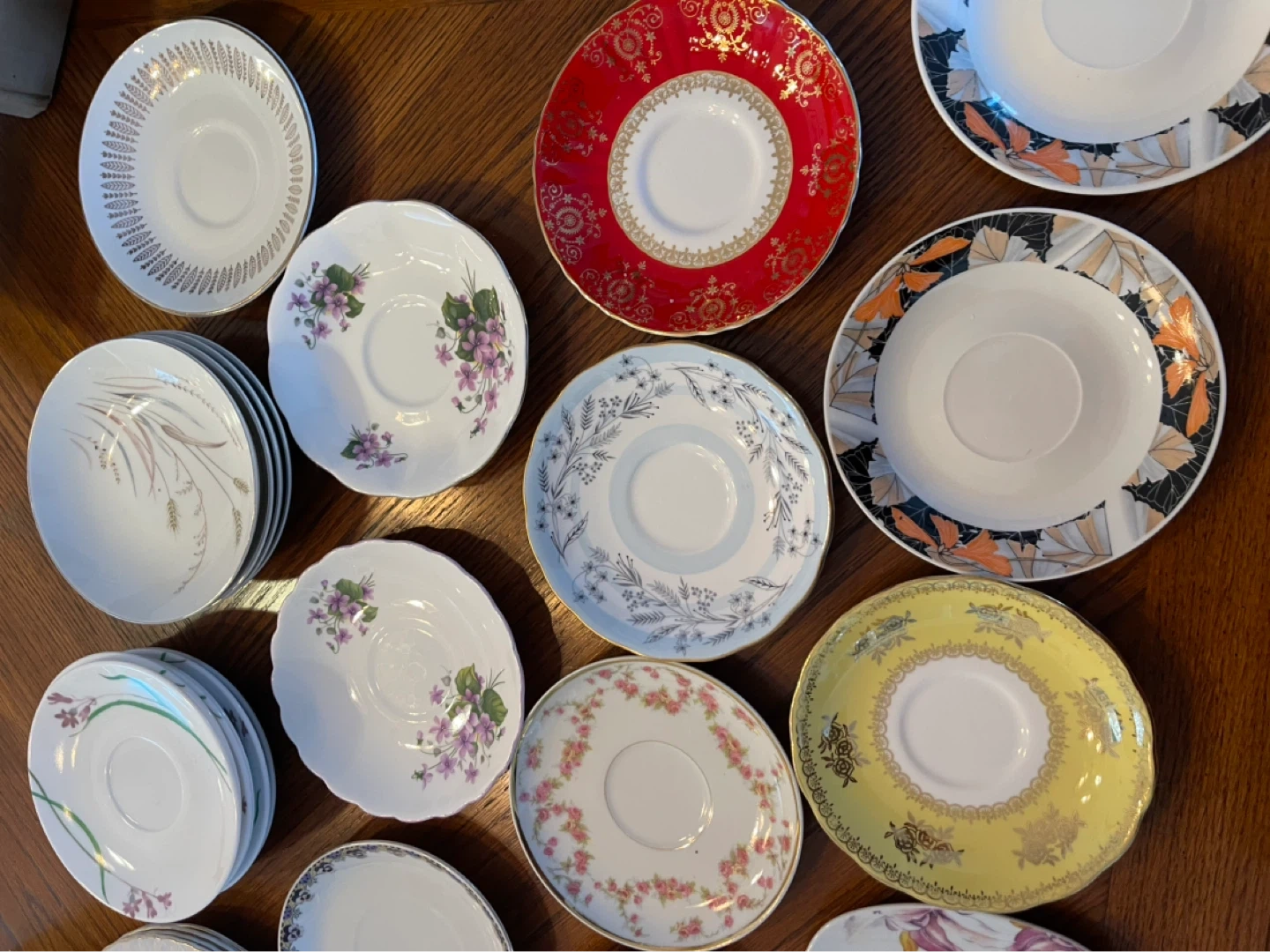 A collection of assorted decorative saucers with various floral and patterned designs. Includes a stack of cream-coloured saucers with a maroon and gold rim. Also features individual saucers with detailed floral motifs and a unique purple design.