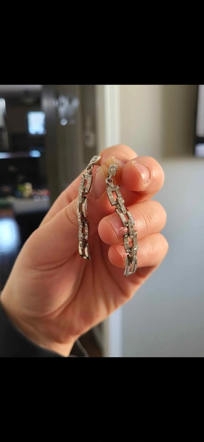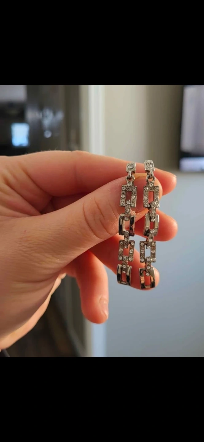 Stylish chain drop earrings featuring a geometric design with sparkling accents. These elegant earrings add a touch of glamour to any outfit. Silver-tone metal construction.