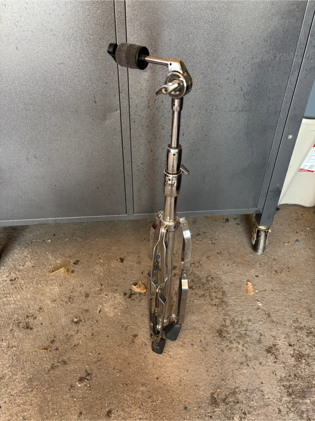 This is a Trak drum set, including several drums, a stool, and a cymbal stand. It comes with drumsticks and a cowbell accessory. Great for aspiring drummers or practice sessions!
