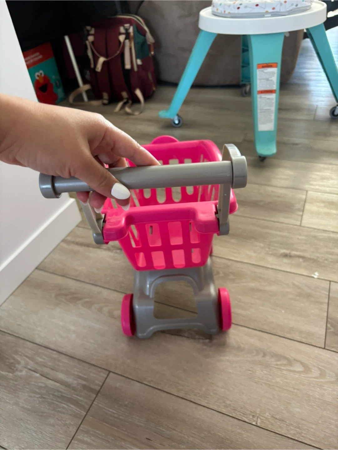 This is a kid's toy shopping cart with a bright pink basket and grey frame. It has a handle for pushing and four wheels for easy movement. It's a fun way for little ones to pretend they're grocery shopping!