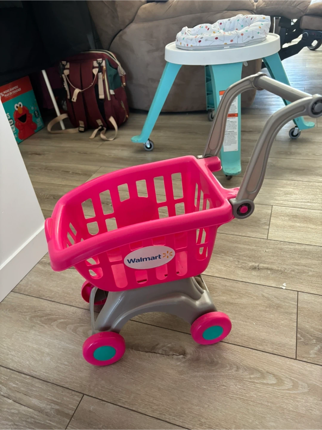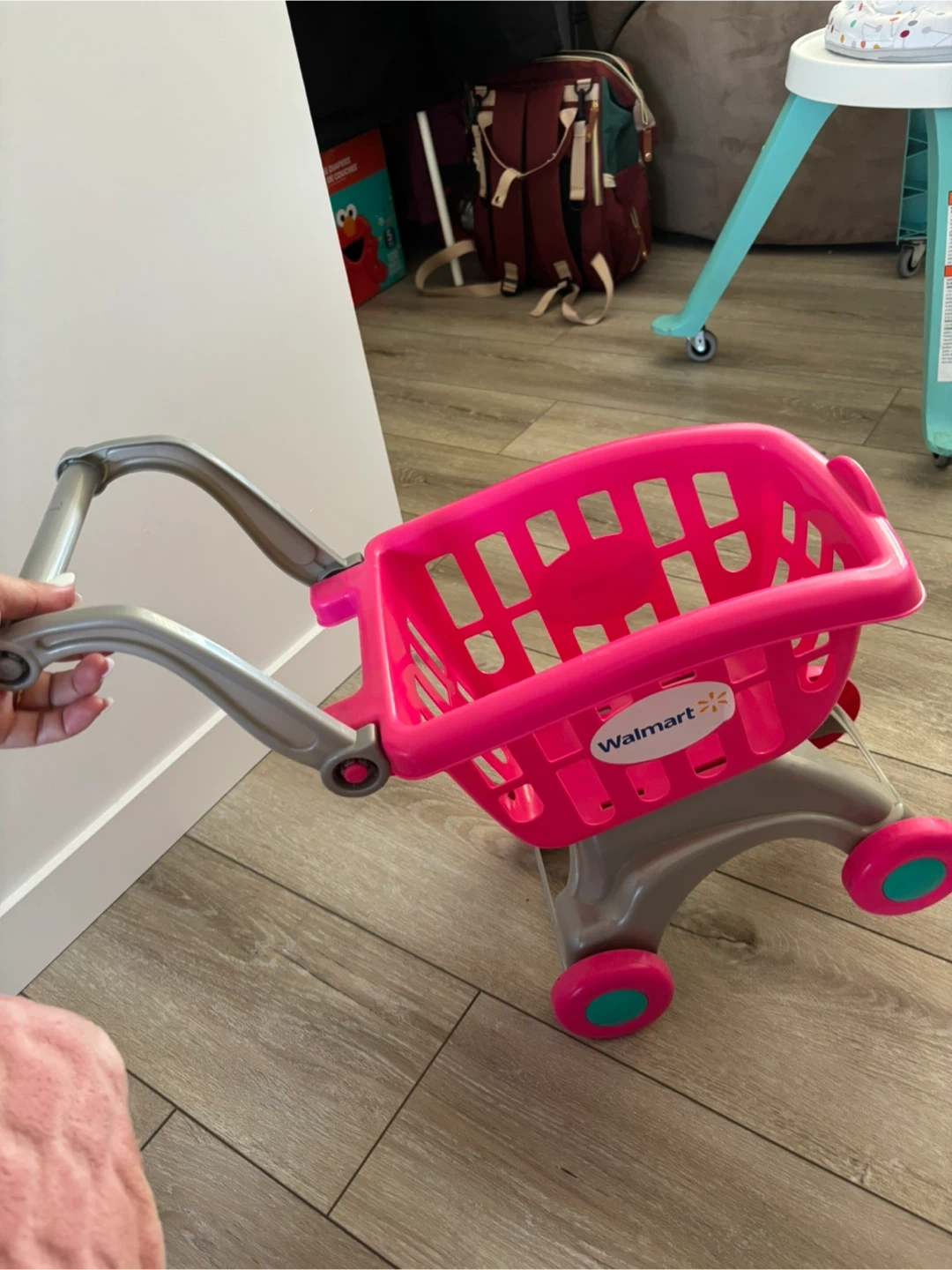 This is a kid's toy shopping cart with a bright pink basket and grey frame. It has a handle for pushing and four wheels for easy movement. It's a fun way for little ones to pretend they're grocery shopping!