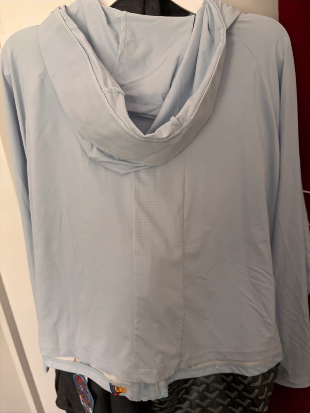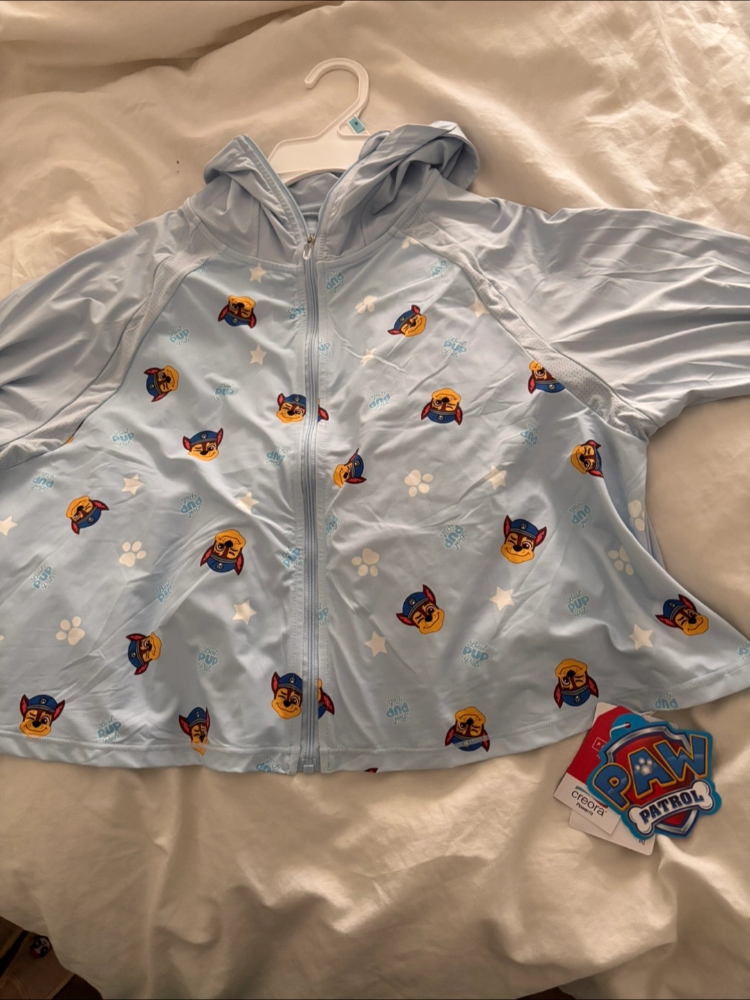 A brand new light blue jacket with original tags, featuring a fun Paw Patrol print all over. This jacket has a hood and a zip-up front. UV 50+ protector. It would be lovely to wear under sunshine. Size 140/68