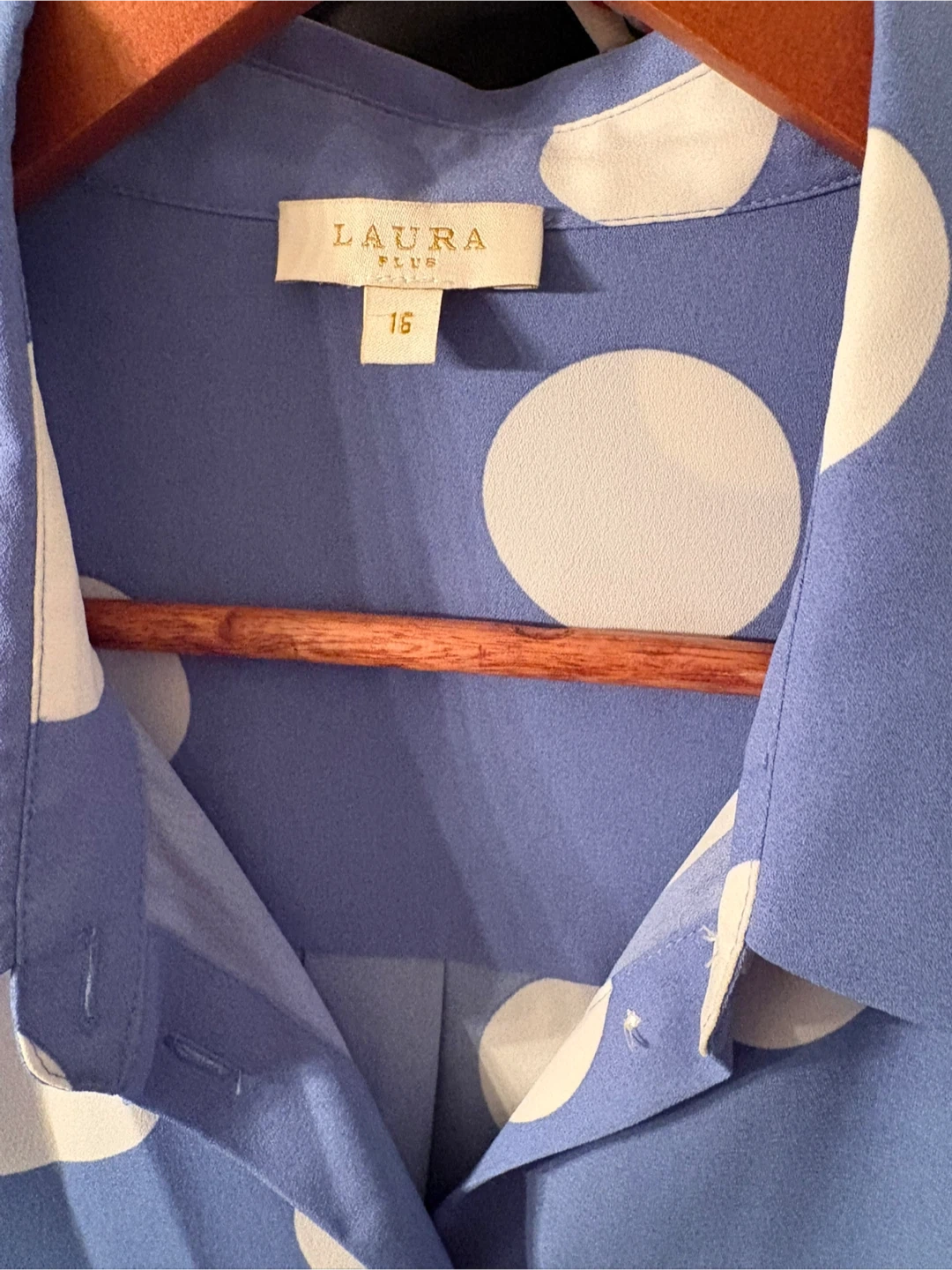 Laura long-sleeved blouse in a blue and white polka dot pattern. It's a size 16. This top would be nice for adding a pop of fun to your wardrobe! Never worn. measures 30in from shoulder to bottom of blouse.