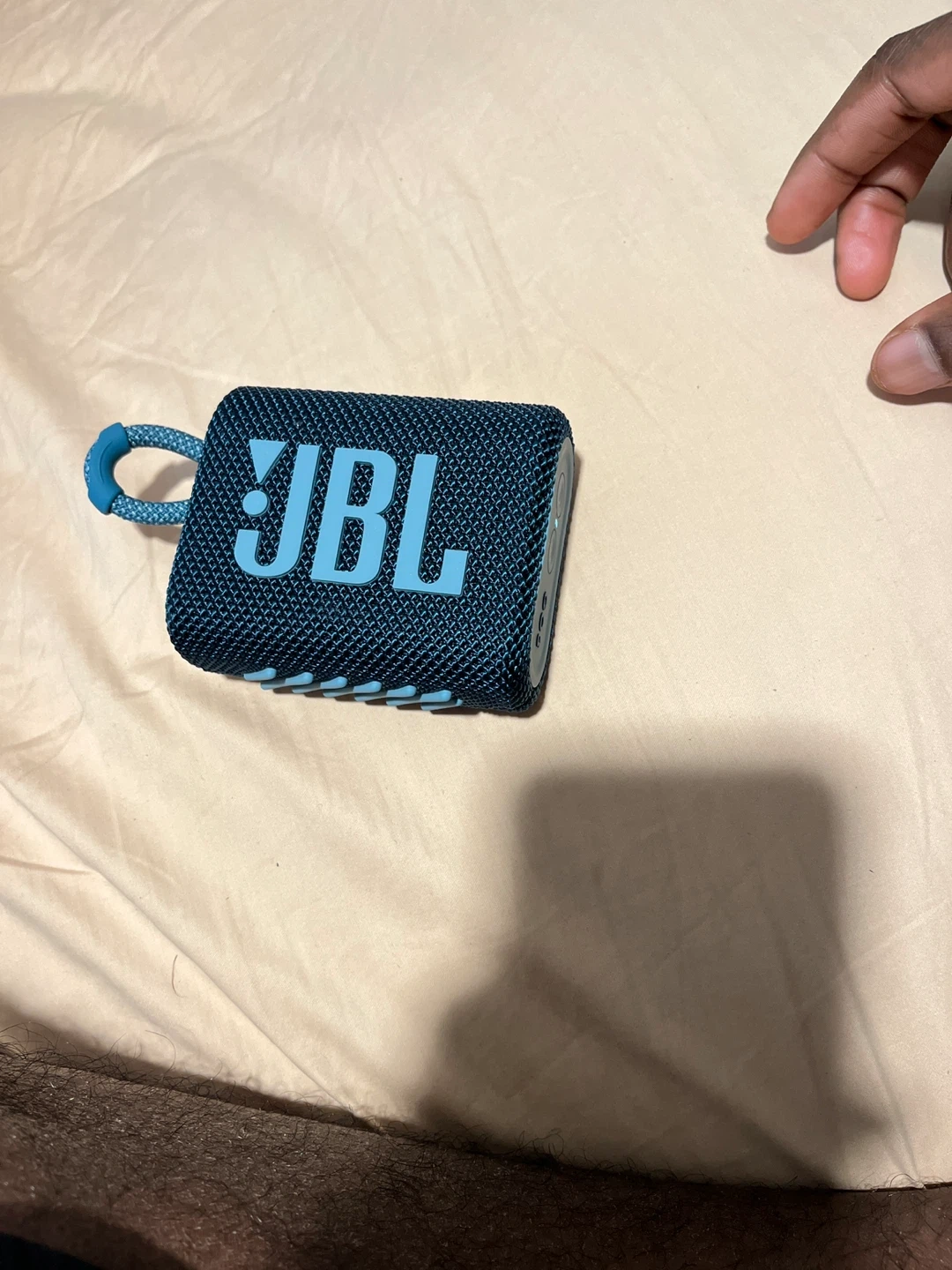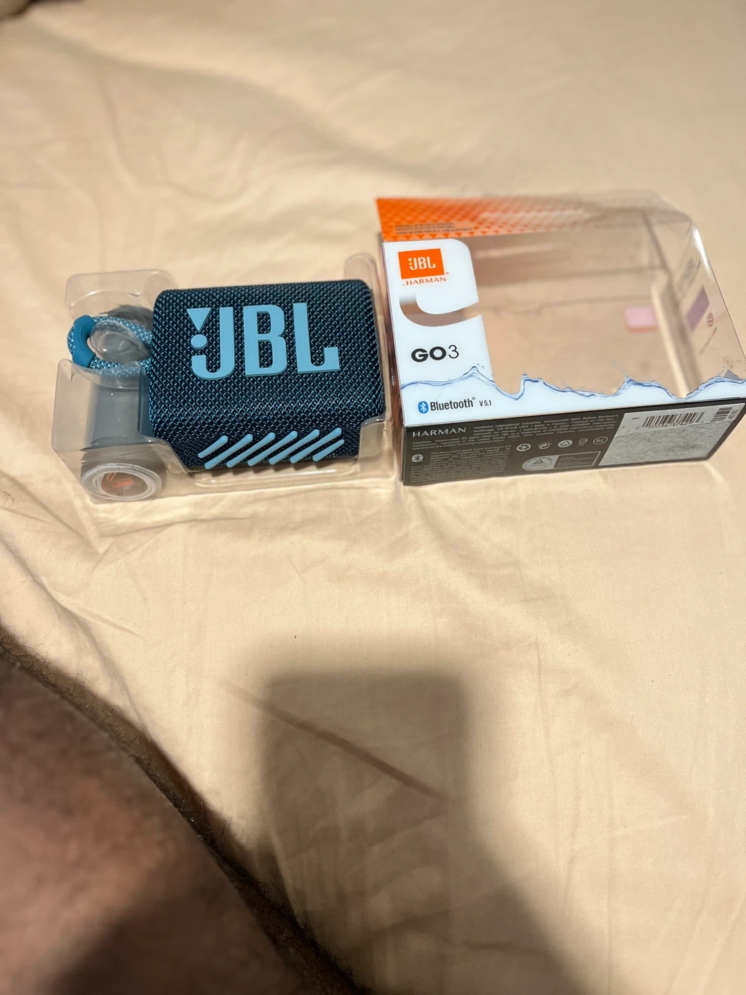 JBL GO 3 portable Bluetooth speaker. Features Bluetooth 5.1 and IP67 waterproof and dustproof rating. Includes USB-C charging cable. Compact and durable design.