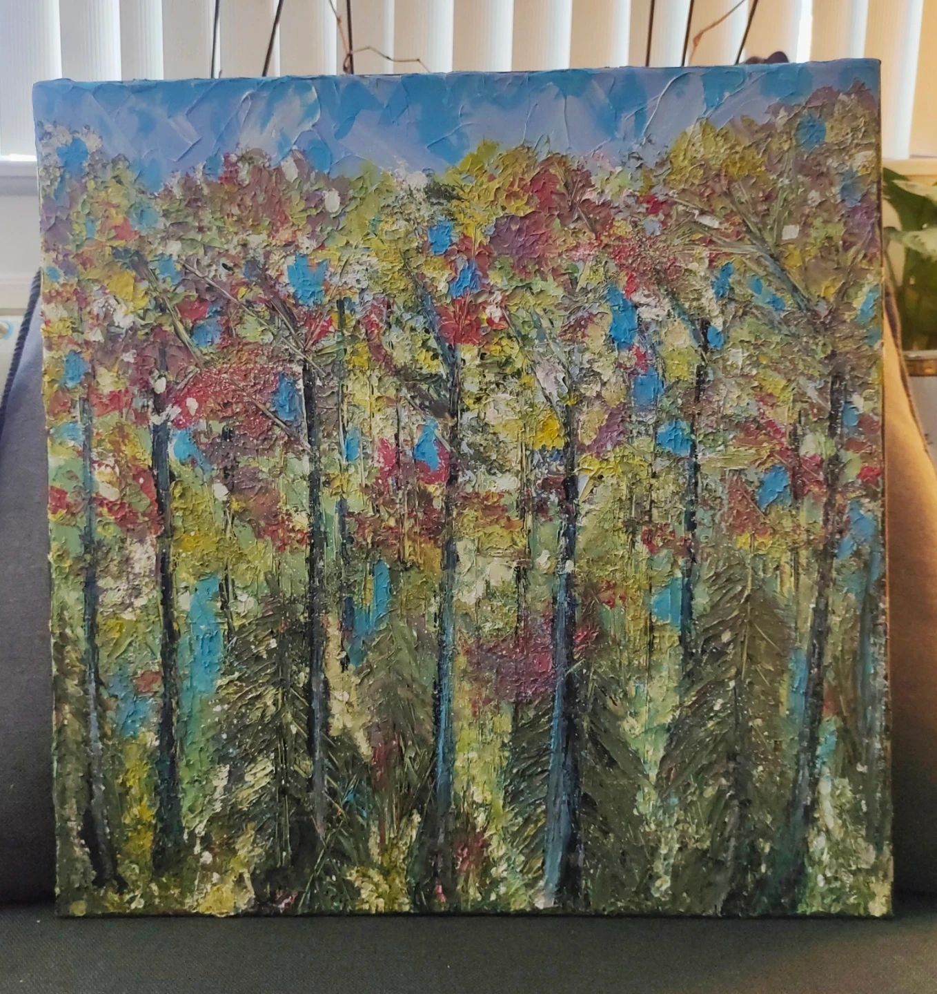 This is a textured painting depicting a vibrant forest scene. It features an impasto style with thick application of paint, giving it a rich, tactile quality. The piece showcases a colourful array of trees against a bright blue sky.