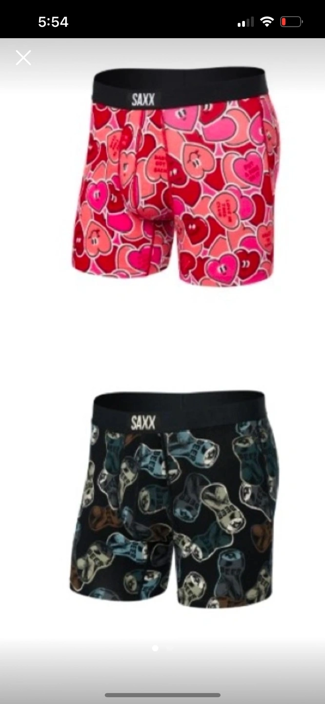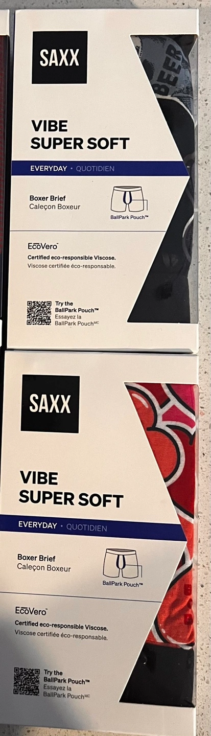 Two pairs of SAXX Vibe Super Soft boxer briefs. Variety of colours and patterns. Ordered the wrong size for Christmas gifts. Has never been removed from the boxes.