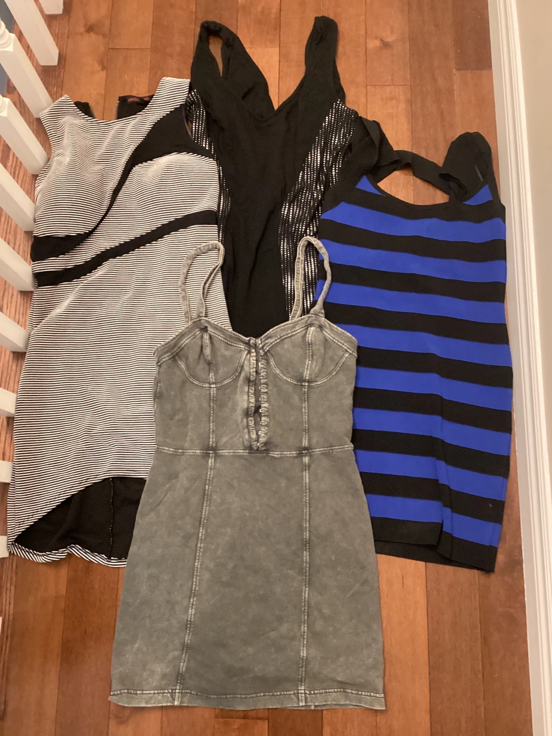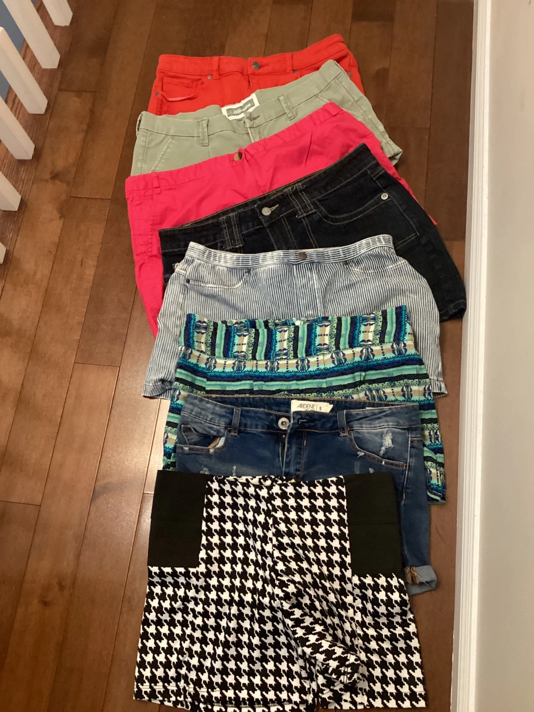 A collection of women's bottoms and tops including shorts, dresses, and a jumpsuit. Various colours and patterns are included. Tommy Hilfiger, Guess, Fashion Nova etc. All items are size medium. 20+ items. SFPF