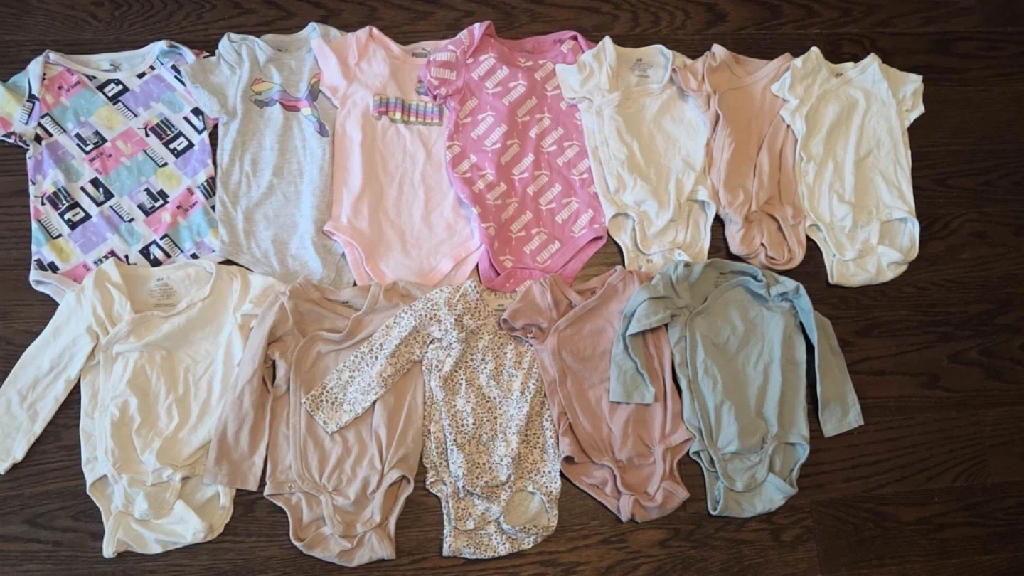 A collection of 11 baby bodysuits in short and long sleeves. Includes Puma branded items and a H&M wrap-style bodysuit. Mostly pastel colours and simple patterns. Cotton material.