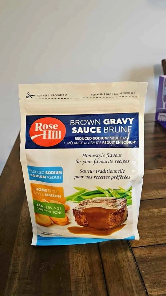 Homestyle Rose Hill brown gravy sauce mix. Reduced sodium. Great for all your favorite recipes. Big bag, 140 servings. Net weight 1 kg.