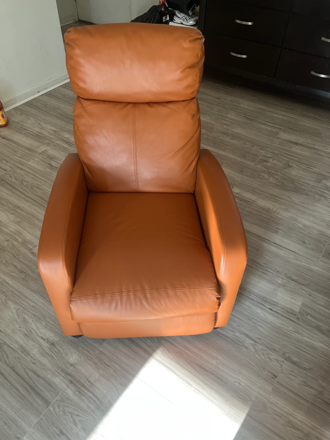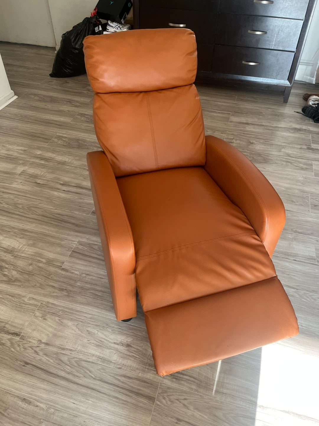 Comfortable brown leather recliner chair. Padded headrest and armrests for extra support. Smooth reclining mechanism. It's a great addition to any living room!
