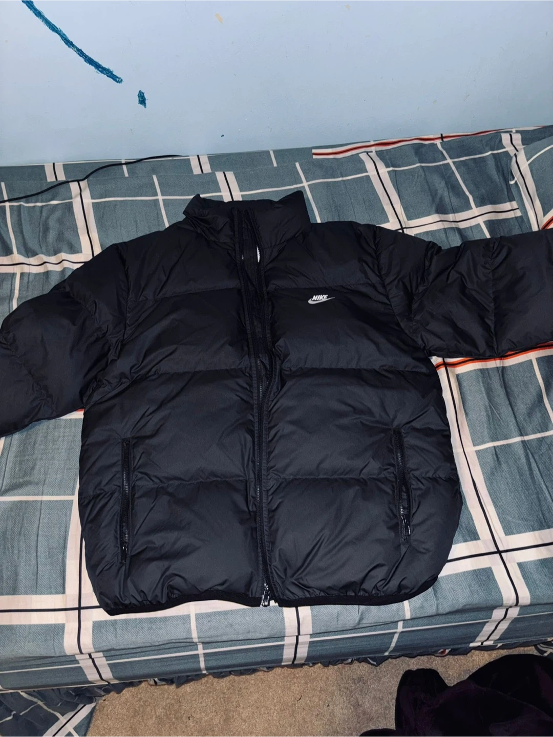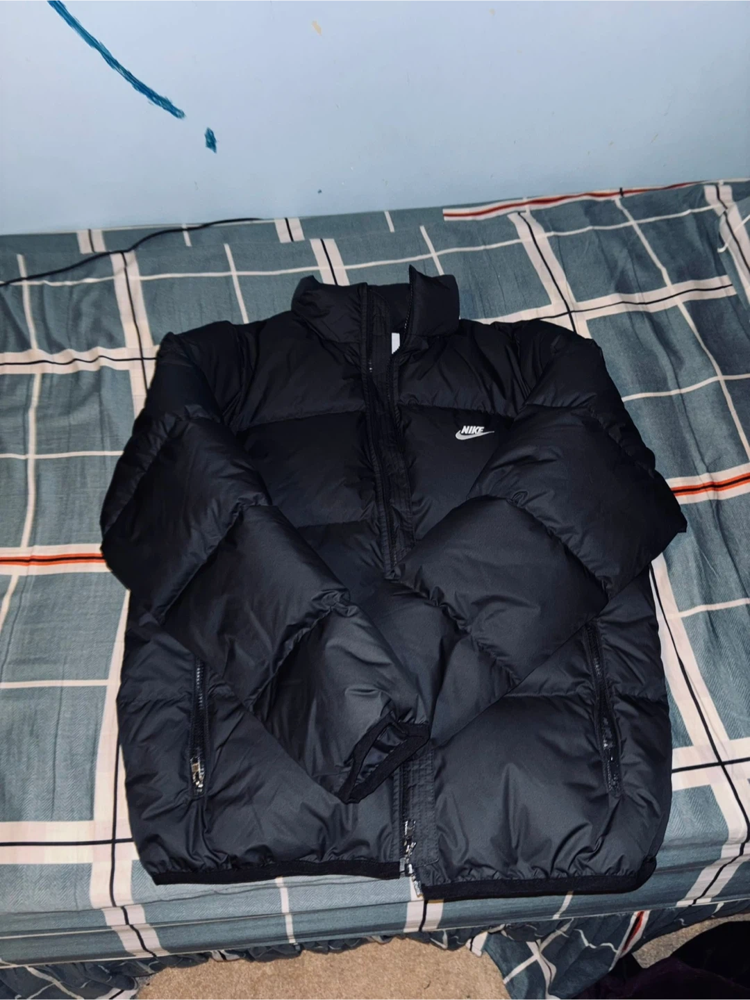 Black Nike Therma-FIT puffer jacket. It's a size S and made in Indonesia. This jacket provides excellent warmth for cooler days!