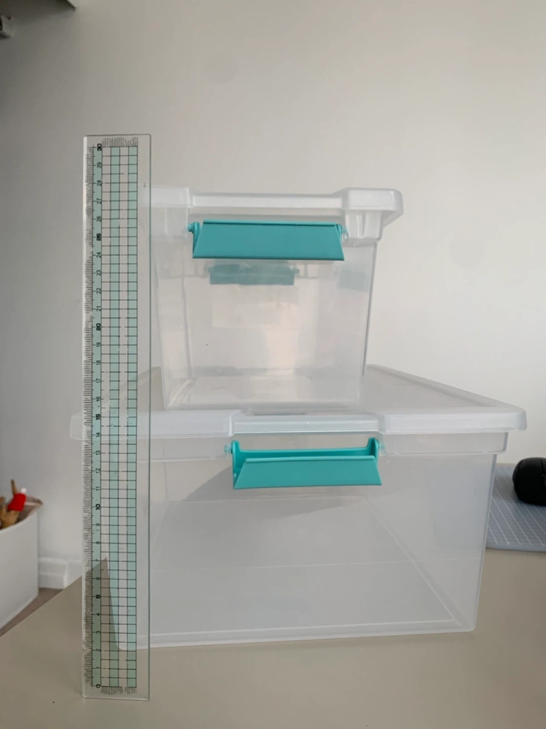 Two clear plastic storage bins with teal snap-tight latches.