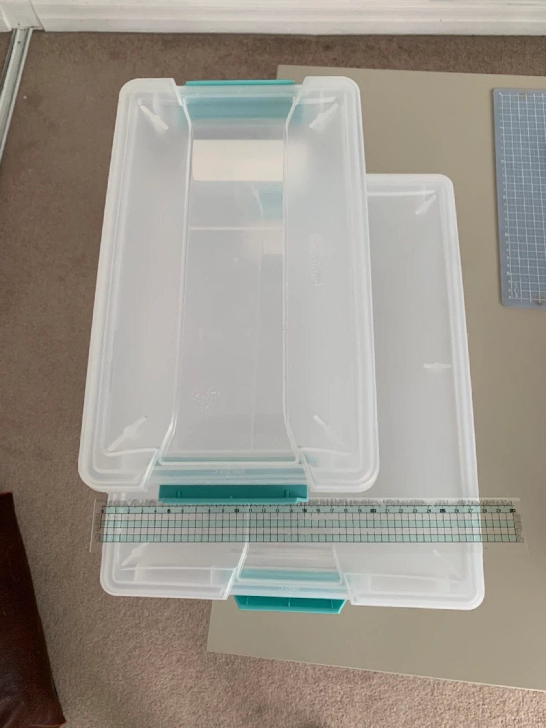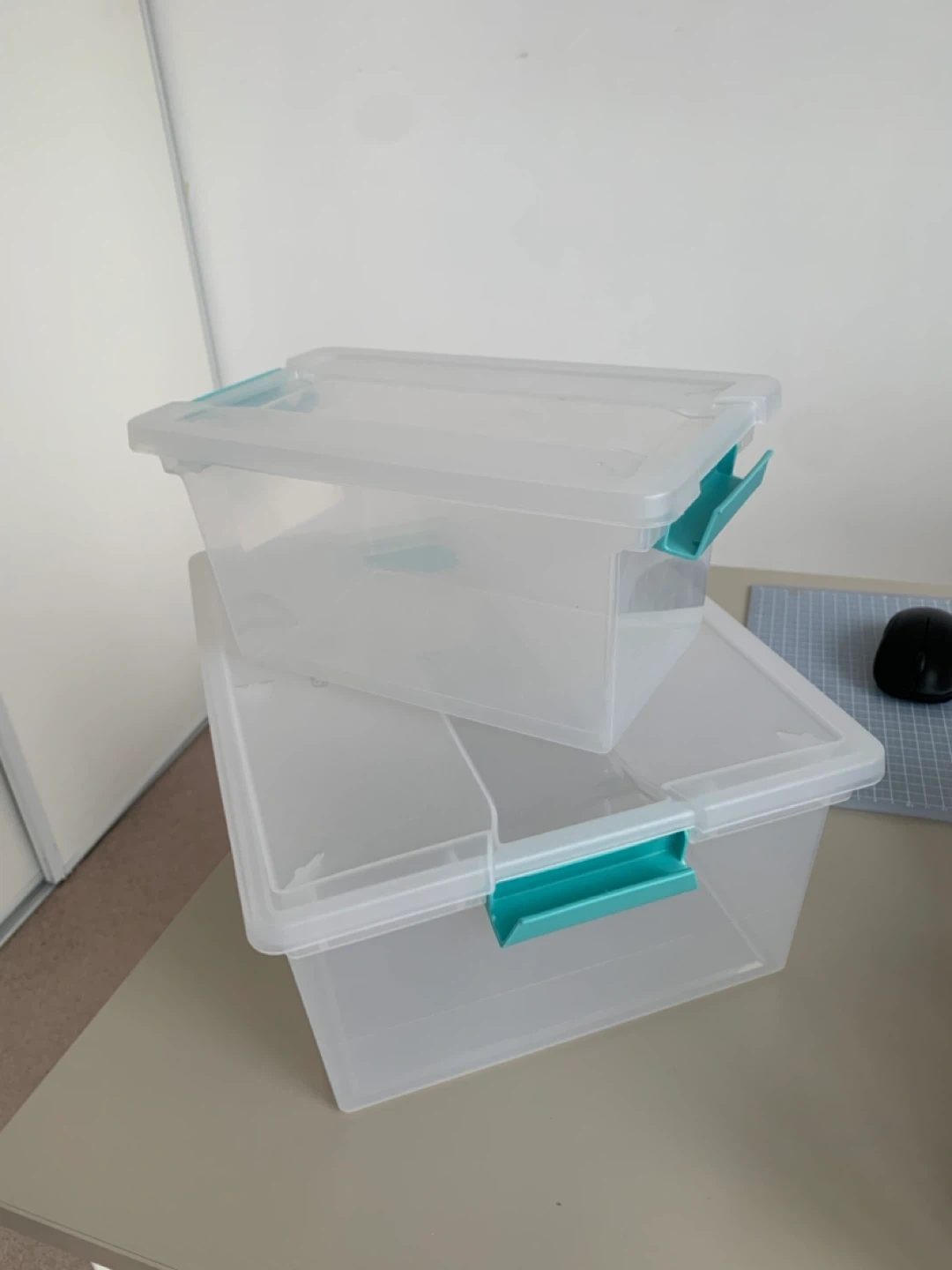 Two clear plastic storage bins with teal snap-tight latches.