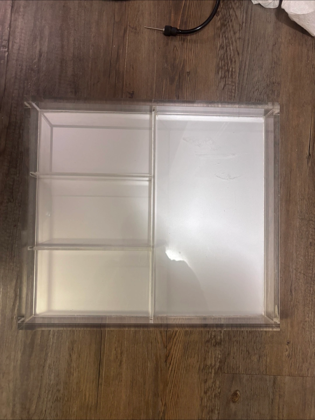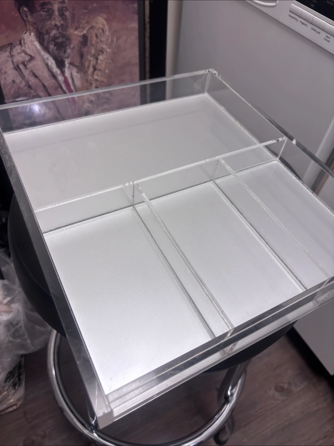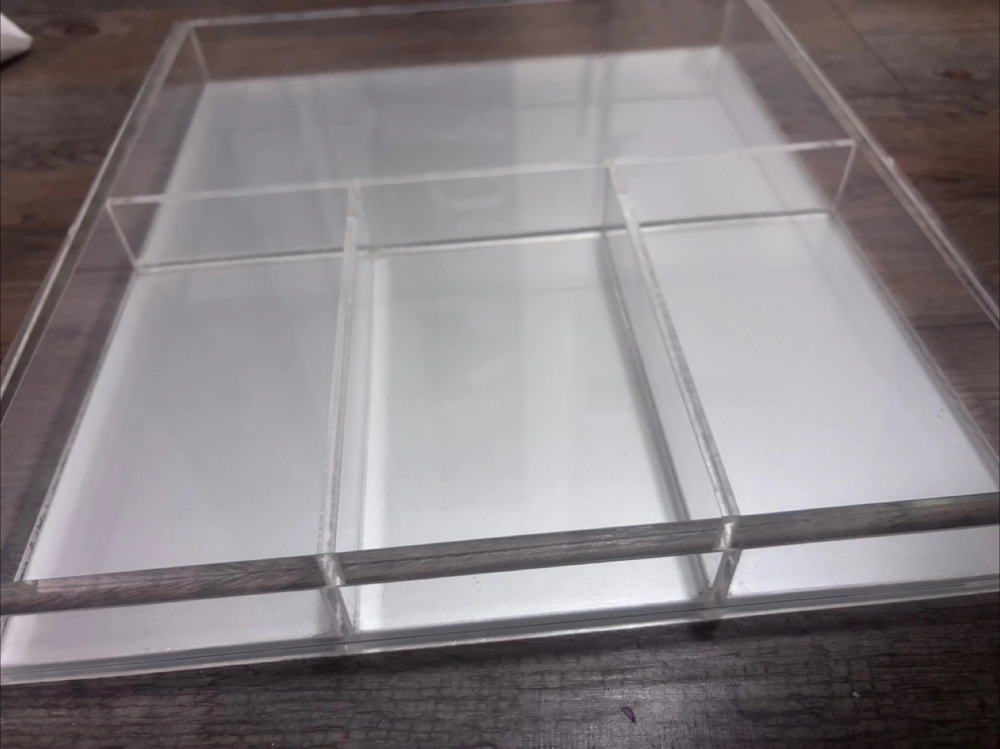 Clear acrylic organizer with multiple compartments.