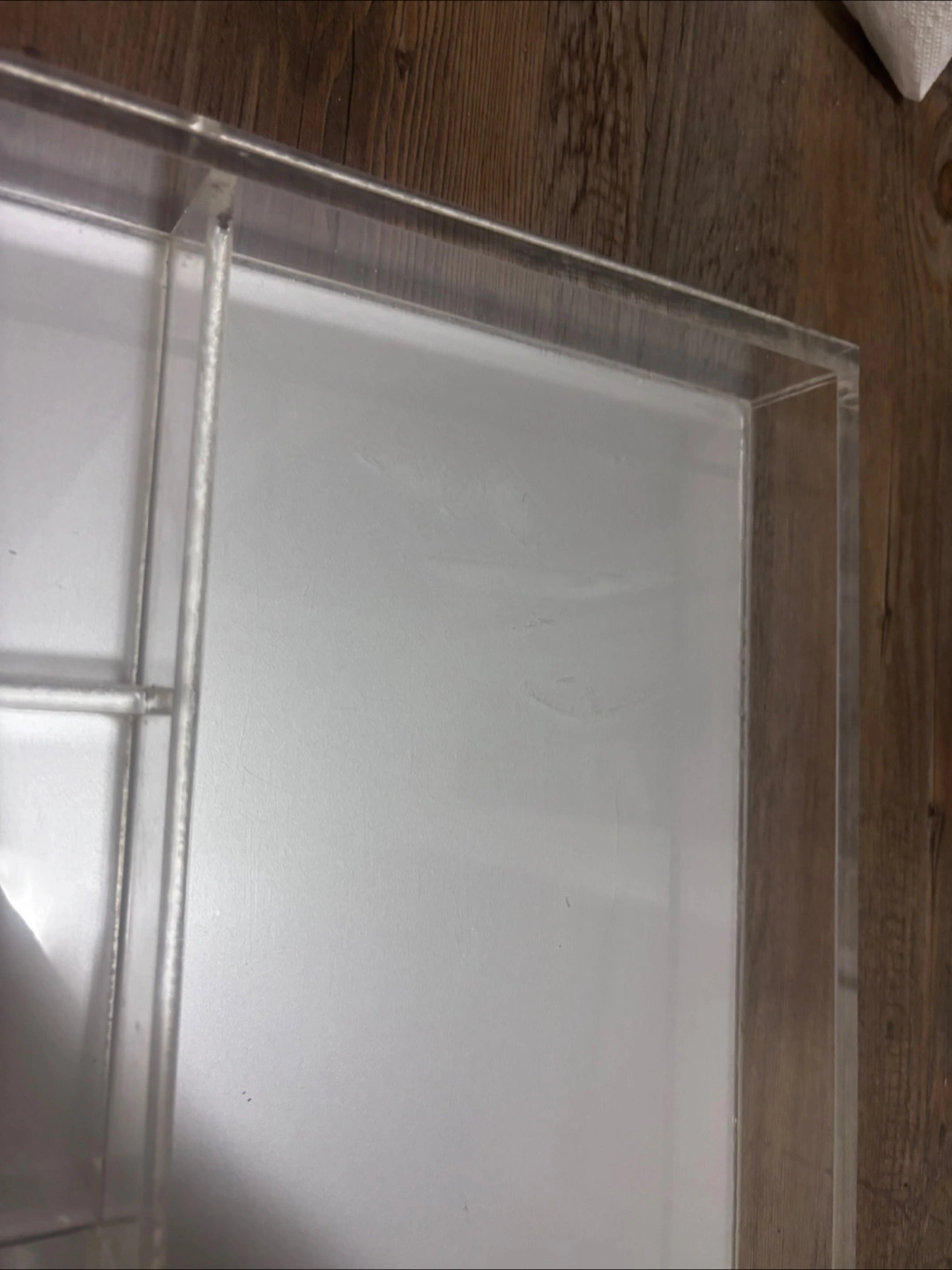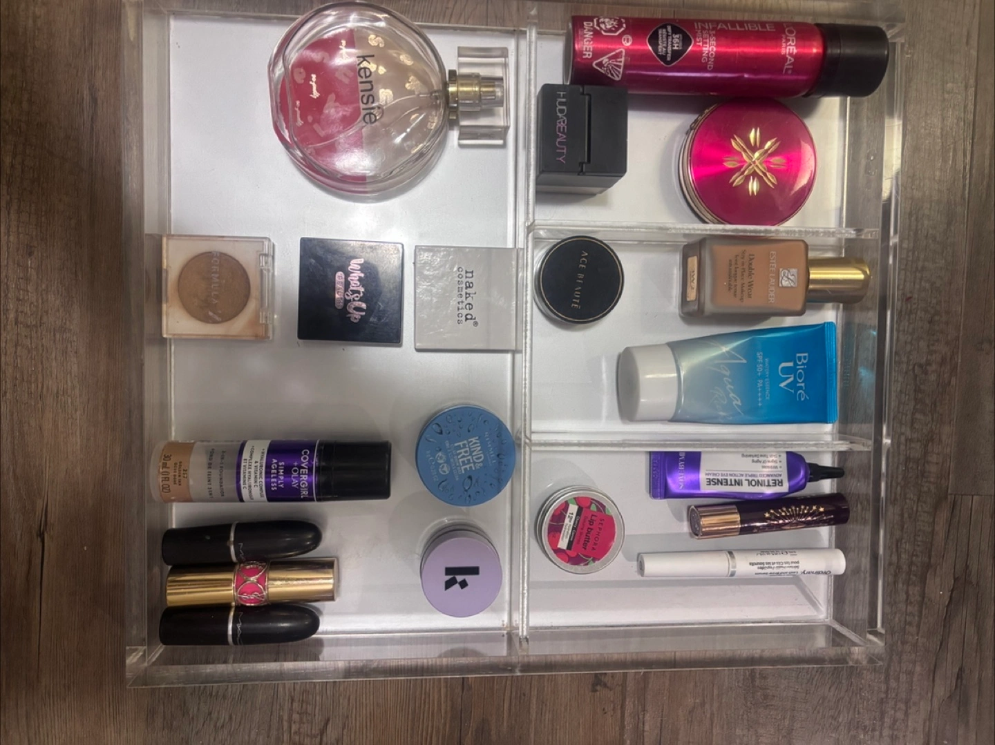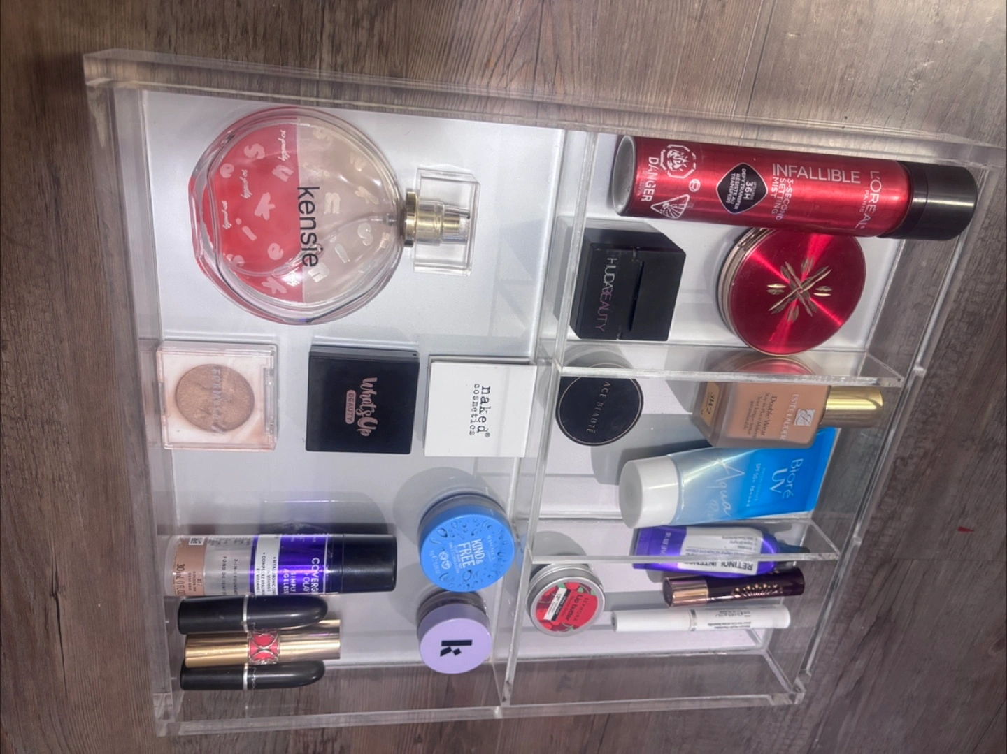 Clear acrylic organizer with multiple compartments.