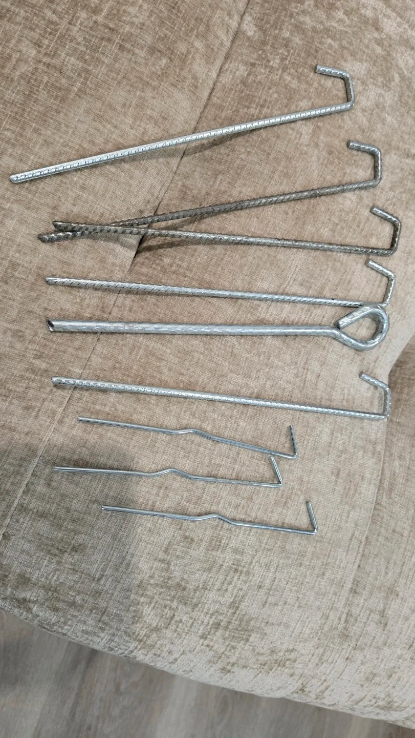 This is a set of metal tent stakes. They appear to be made of galvanized steel. The set includes various types for different ground conditions. These stakes are essential for securing tents and tarps outdoors.