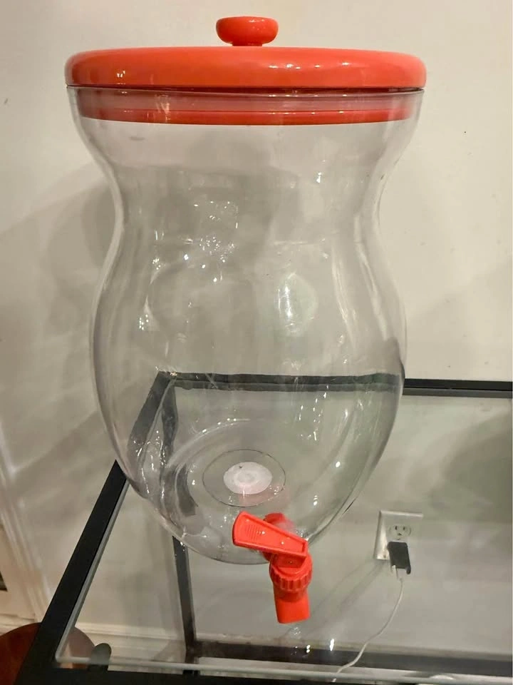 Clear beverage dispenser with red lid and easy-pour spigot. Perfect for parties, events, lemonade, iced tea, or infused water. In good condition, clean and ready to use. Lightweight and easy to refill. Great for hosting or summer gatherings. Pickup: Kitchener area.