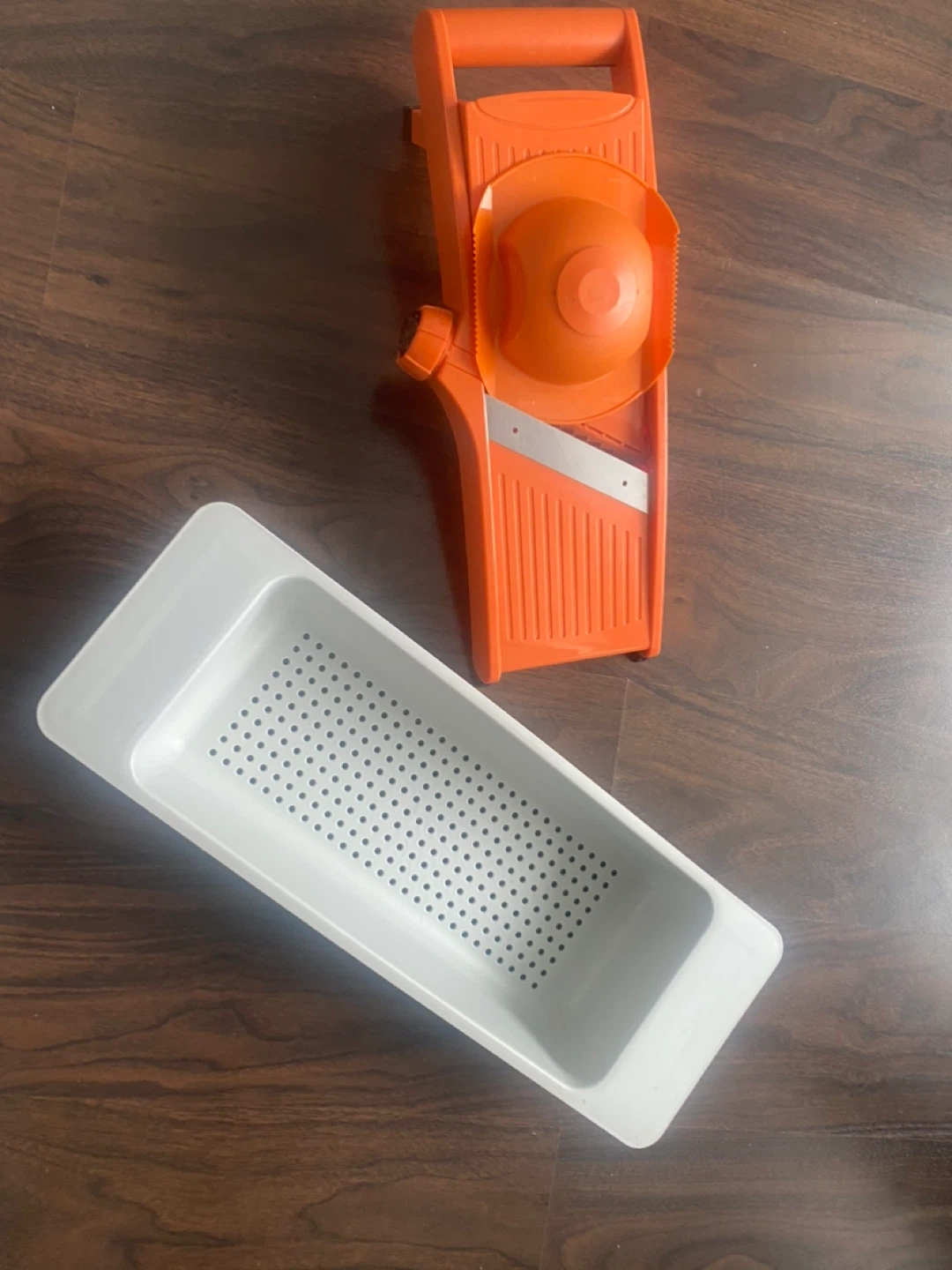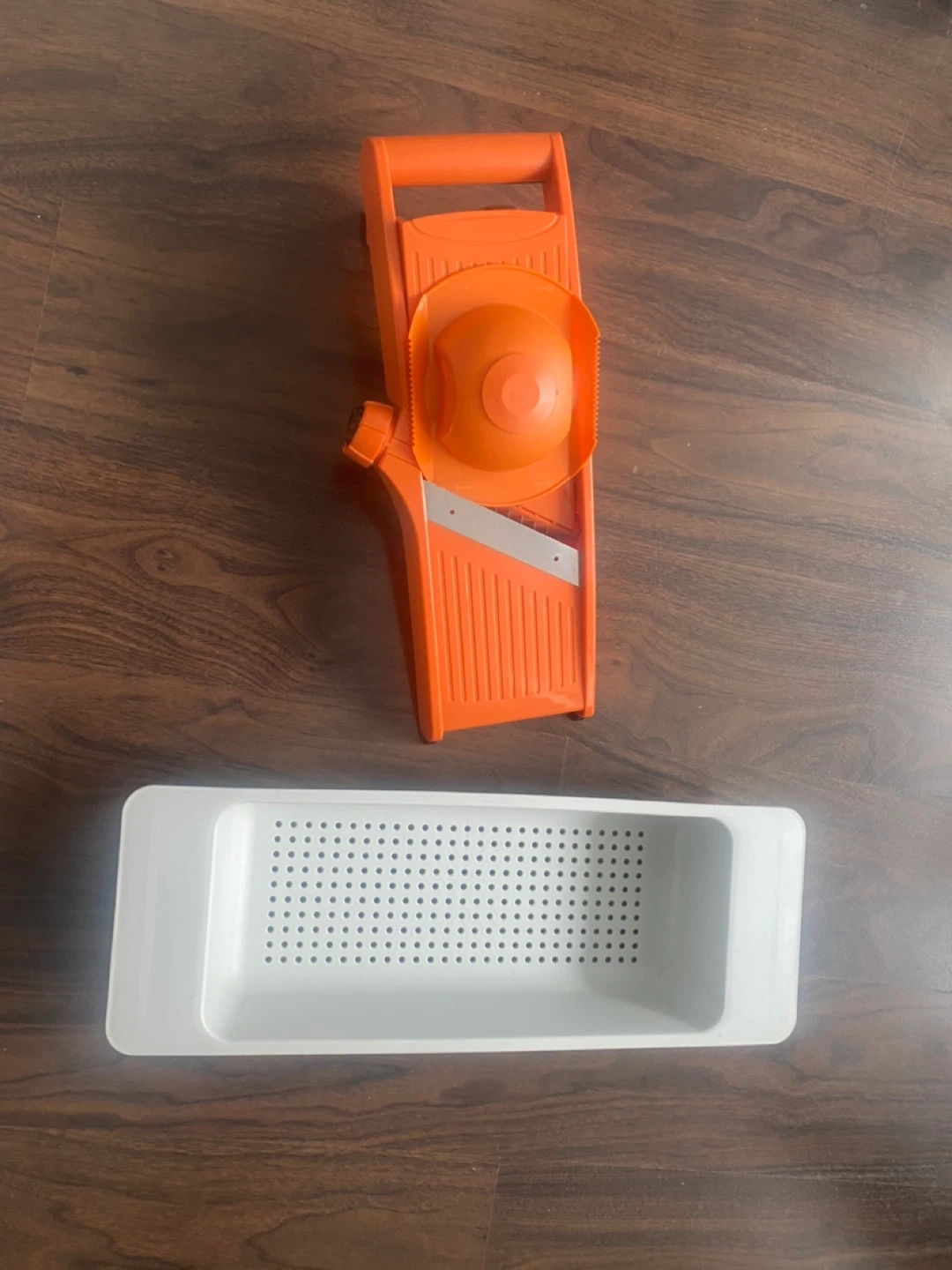 This two-piece kitchen tool includes an orange slicer and a grey collection bin. It's made of plastic and designed for slicing vegetables. The slicer has adjustable blades for different thicknesses. Useful for meal prep!