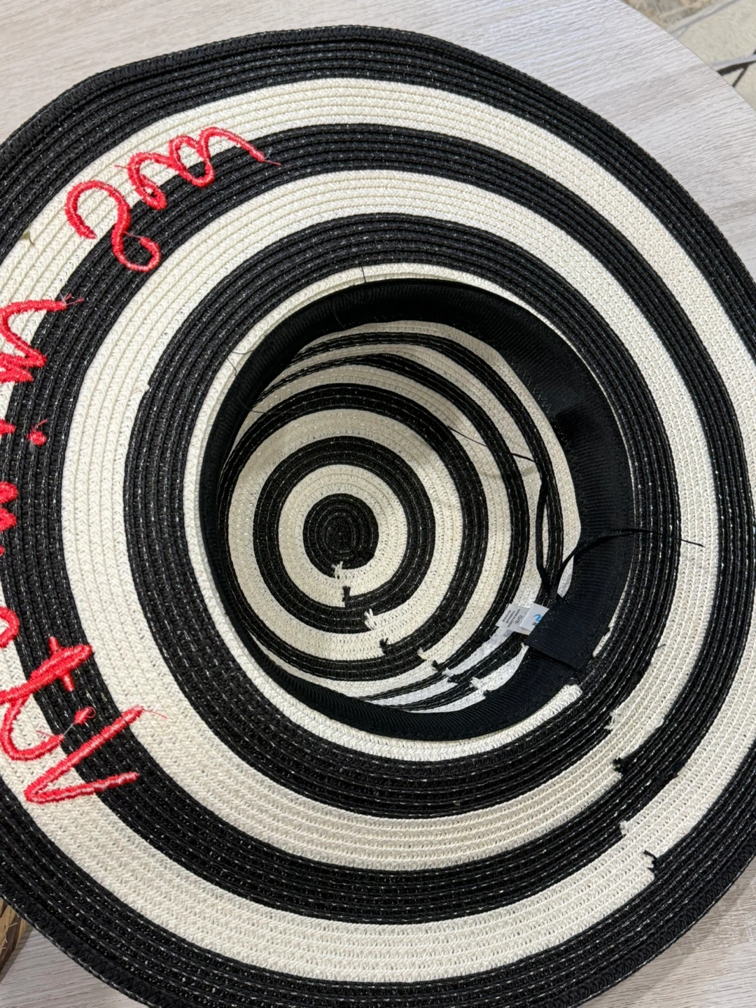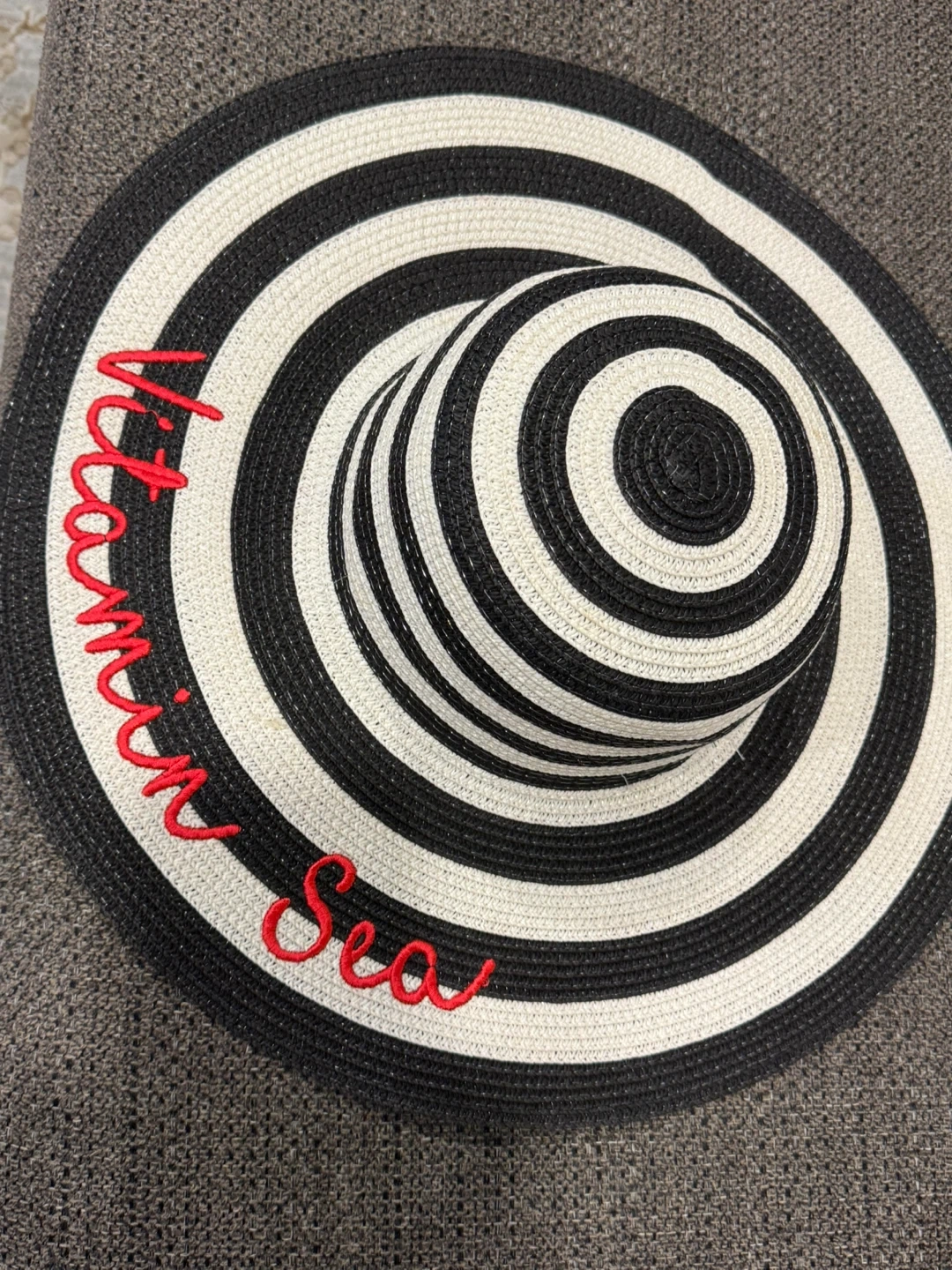 This wide-brimmed straw hat features a classic black and white stripe pattern. It has "Vitamin Sea" embroidered in red script on the brim. Great for sun protection at the beach or pool!