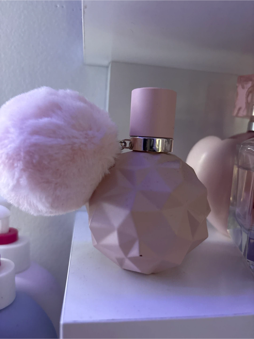 This is a bottle of Ariana Grande Sweet Like Candy perfume. It features a faceted light pink bottle with a fluffy pink pom-pom attached. A silver band with the brand name is around the neck of the bottle. This scent is known for its sweet, playful fragrance.