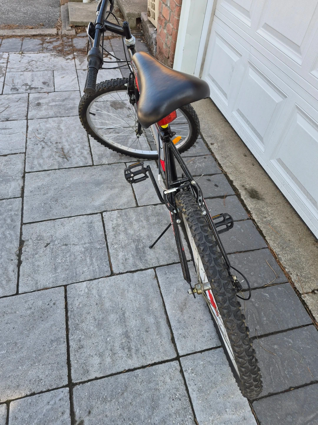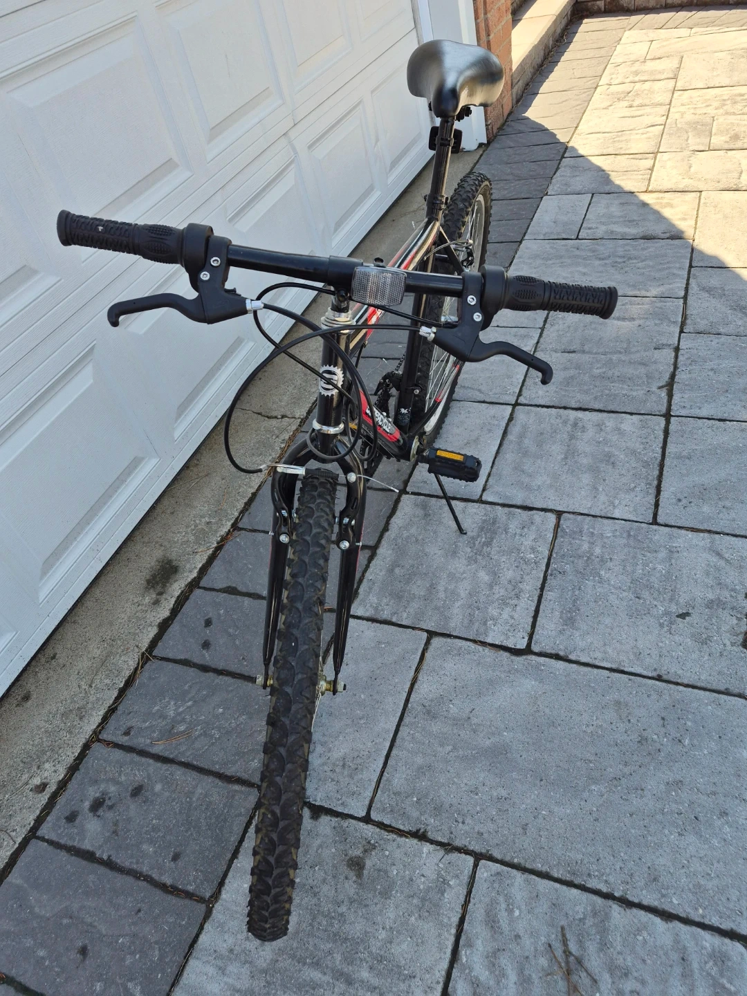 This is a Supercycle 1800 hardtail mountain bike with 26-inch wheels. It's black with red and grey accents. The bike has a kickstand. It's great for commuting or recreational rides!