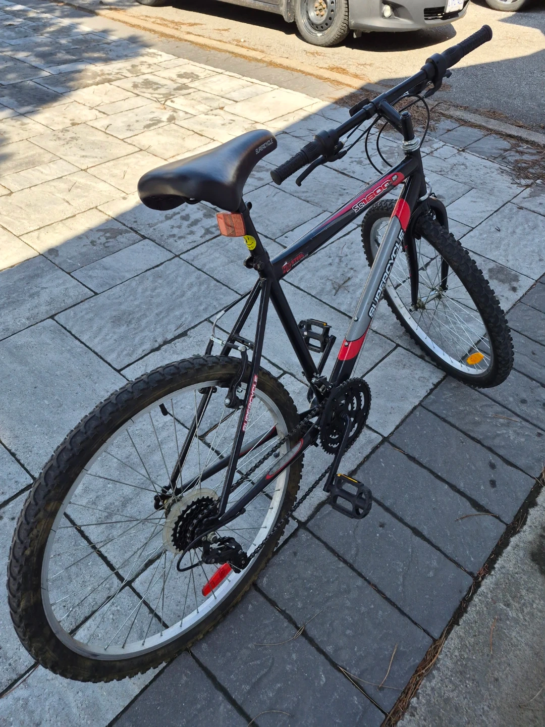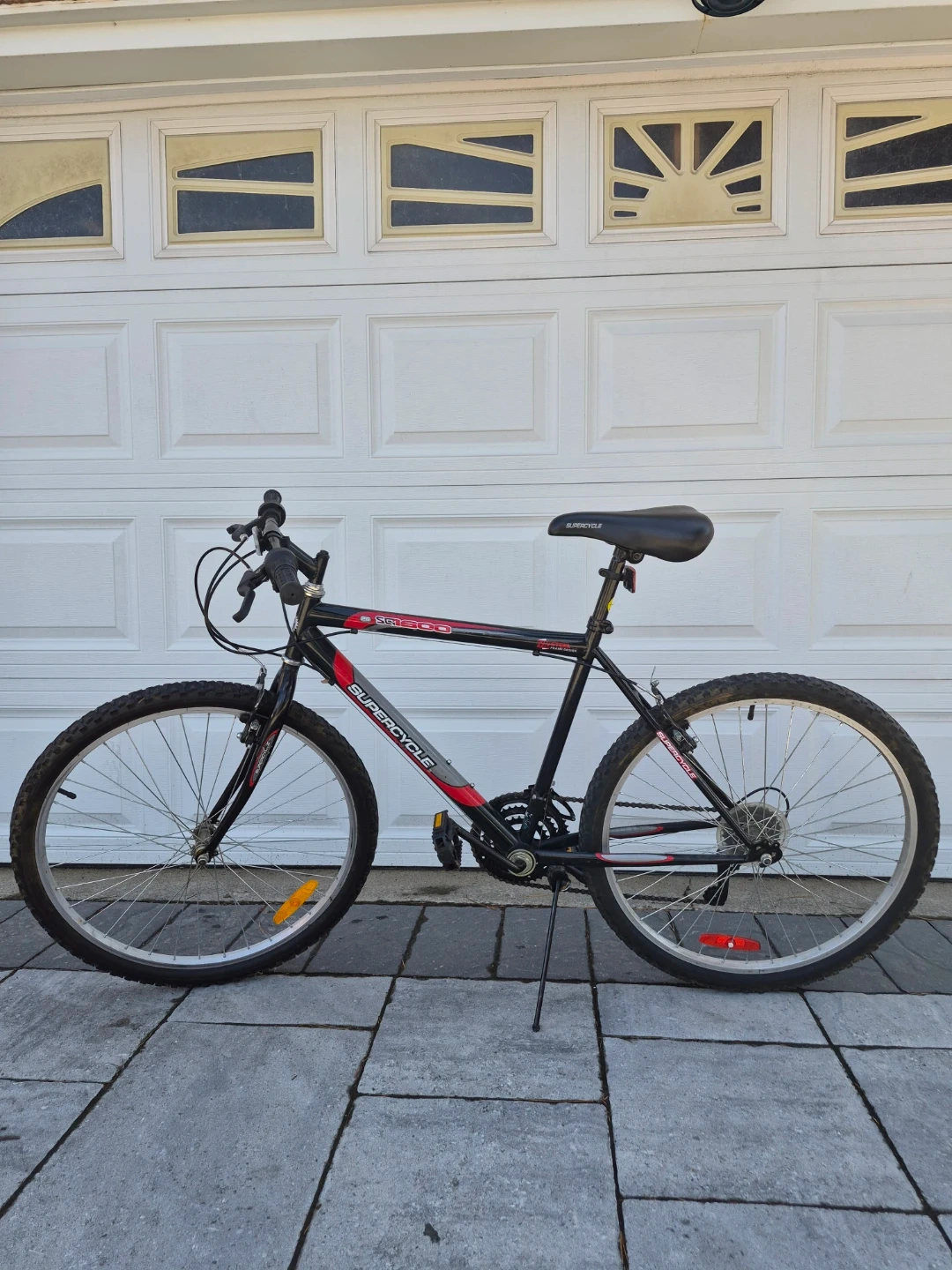 This is a Supercycle 1800 hardtail mountain bike with 26-inch wheels. It's black with red and grey accents. The bike has a kickstand. It's great for commuting or recreational rides!