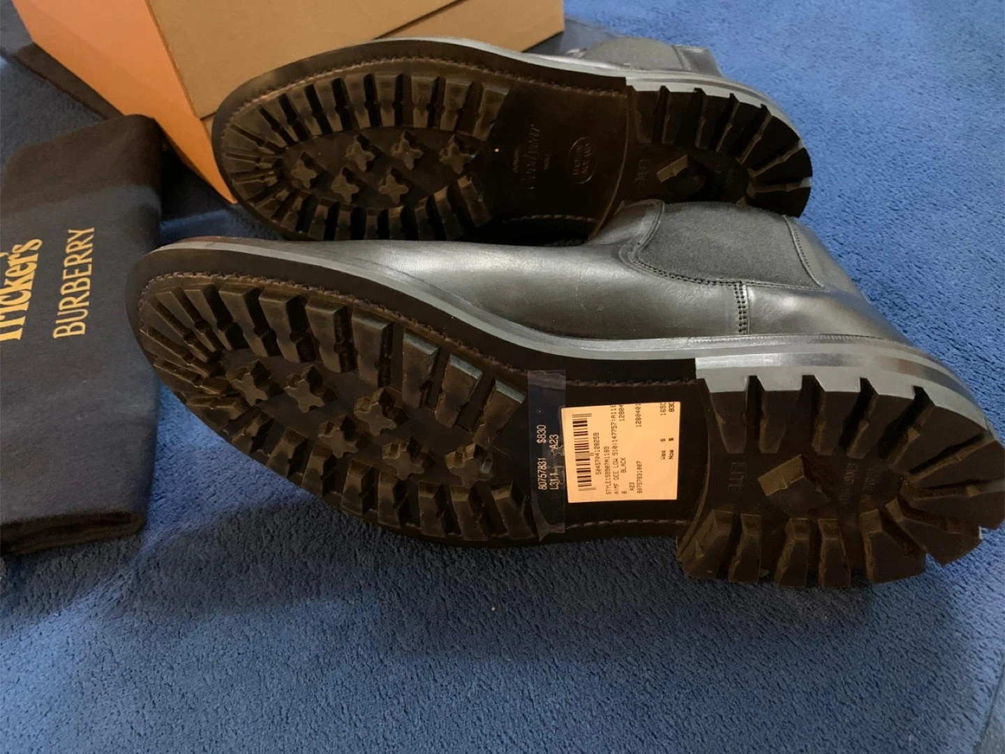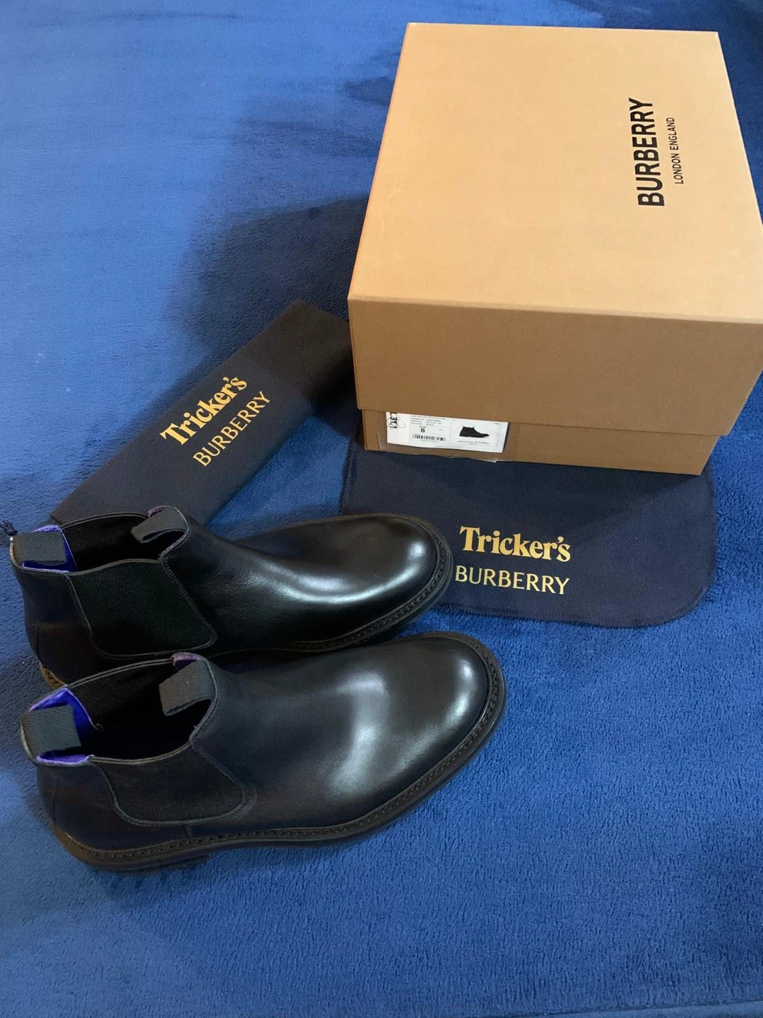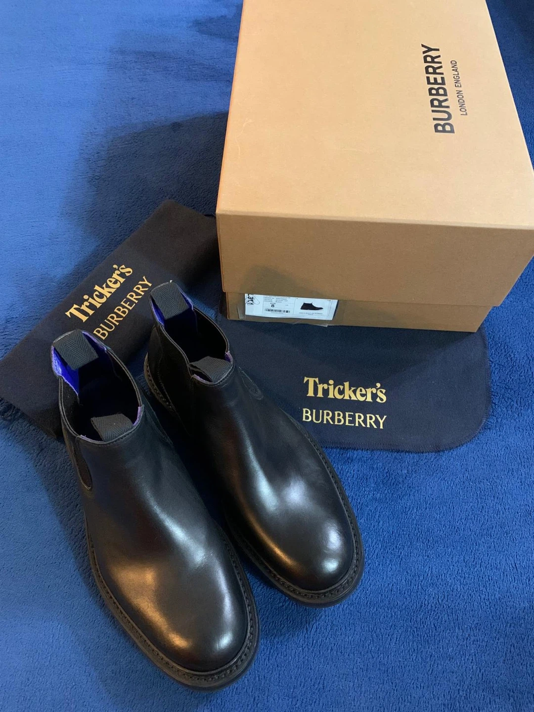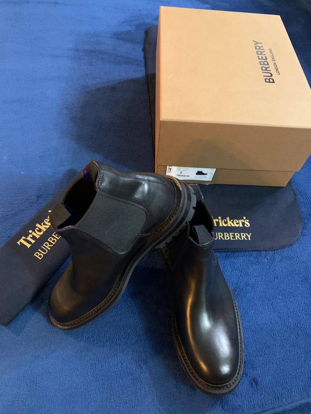 Authentic Tricker's and Burberry collaborated on these black leather Chelsea boots. Identified as the “AIMF Dee Low” model. It features a distinctive and robust black lug sole, designed for enhanced grip and durability. The design blends luxury fashion with a rugged, practical appeal. They're made from smooth leather with elastic side panels. Includes original box and dust bags. Originally $1650 retail. Price is firm.
