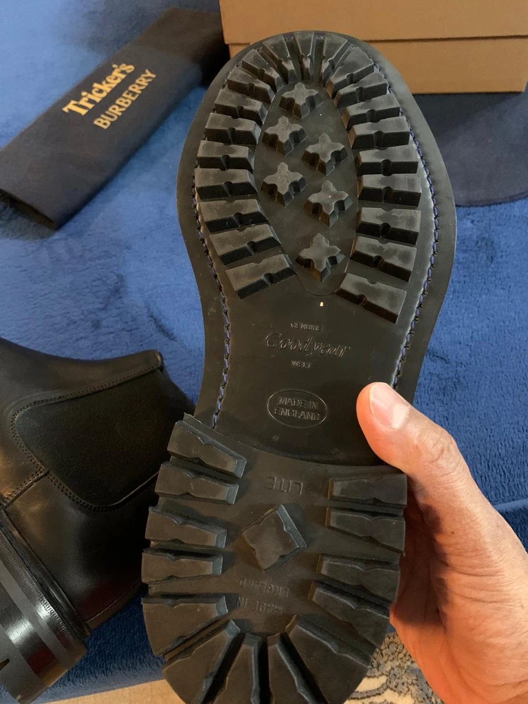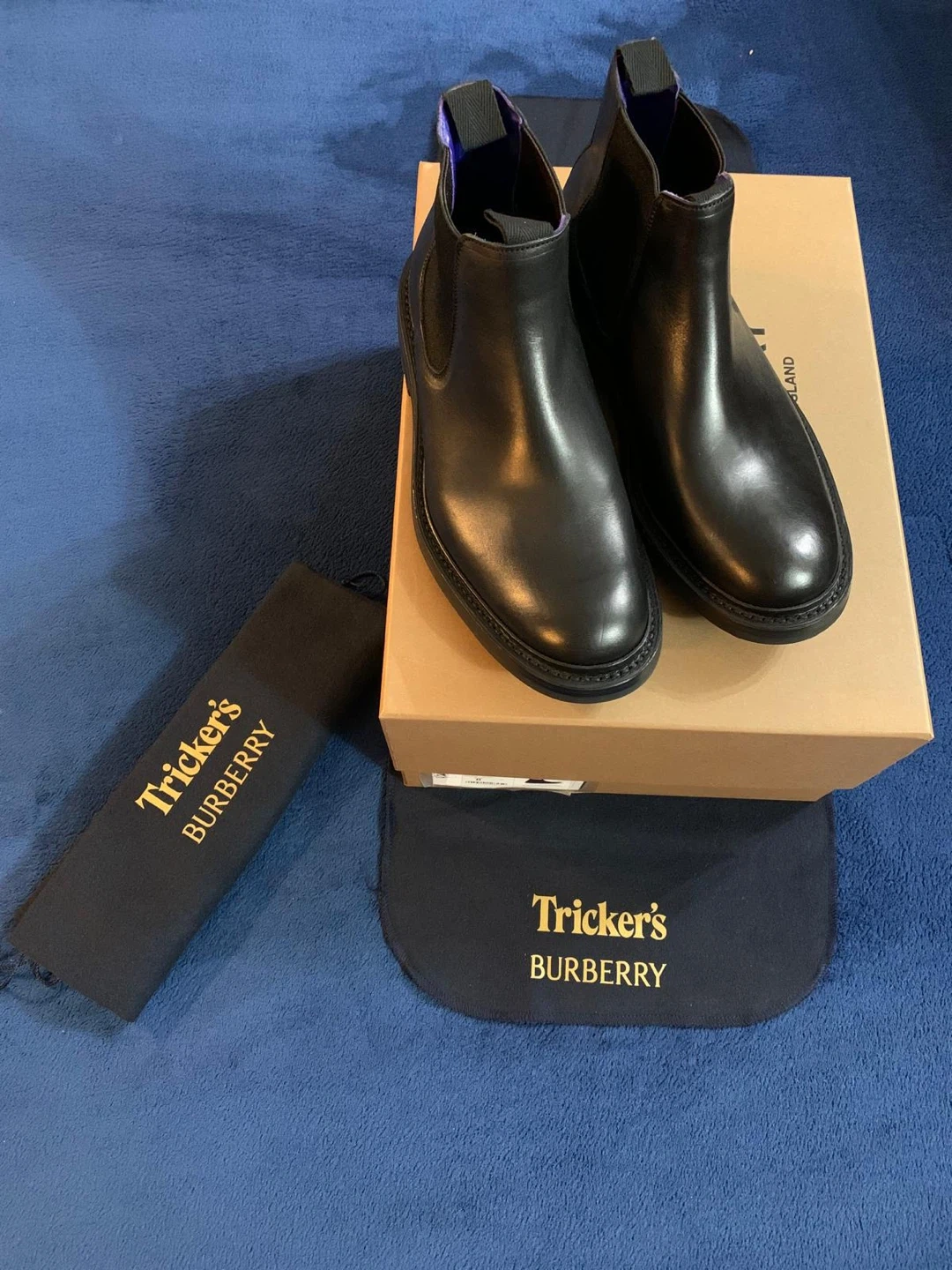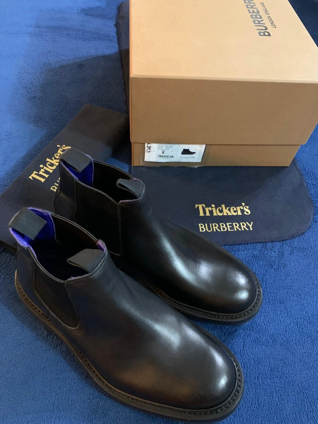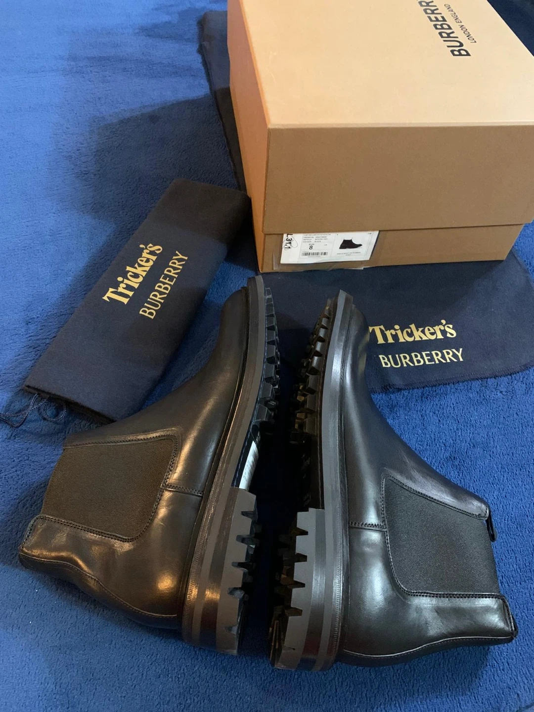 Authentic Tricker's and Burberry collaborated on these black leather Chelsea boots. Identified as the “AIMF Dee Low” model. It features a distinctive and robust black lug sole, designed for enhanced grip and durability. The design blends luxury fashion with a rugged, practical appeal. They're made from smooth leather with elastic side panels. Includes original box and dust bags. Originally $1650 retail. Price is firm.