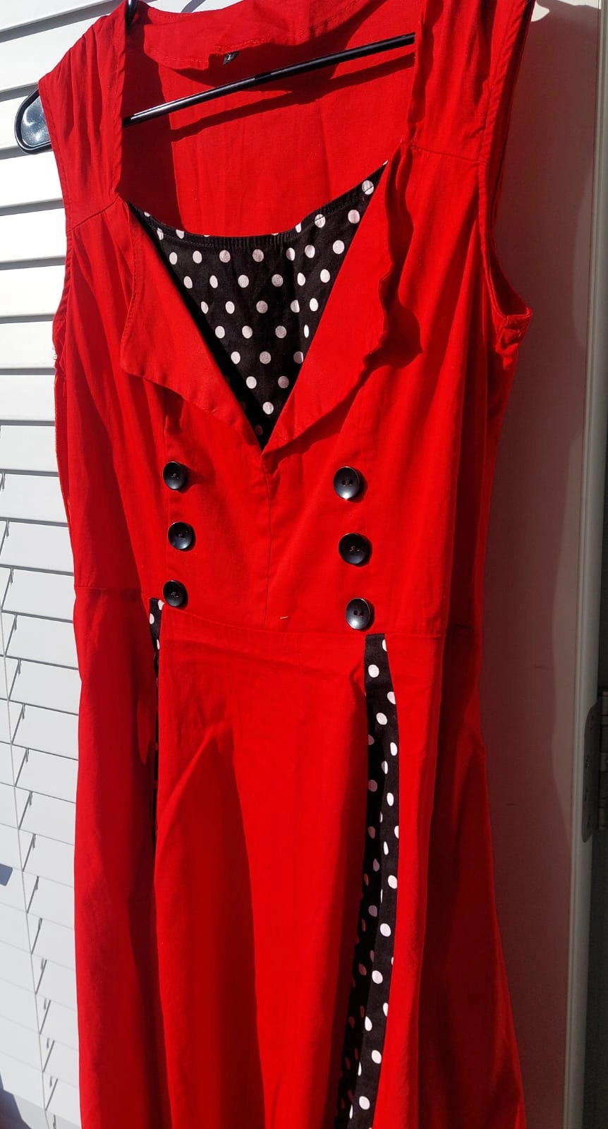 +A red sleeveless dress with black polka dot accents. The dress is a fit and flare style with a square neckline. Has a side zipper helps in wearing it