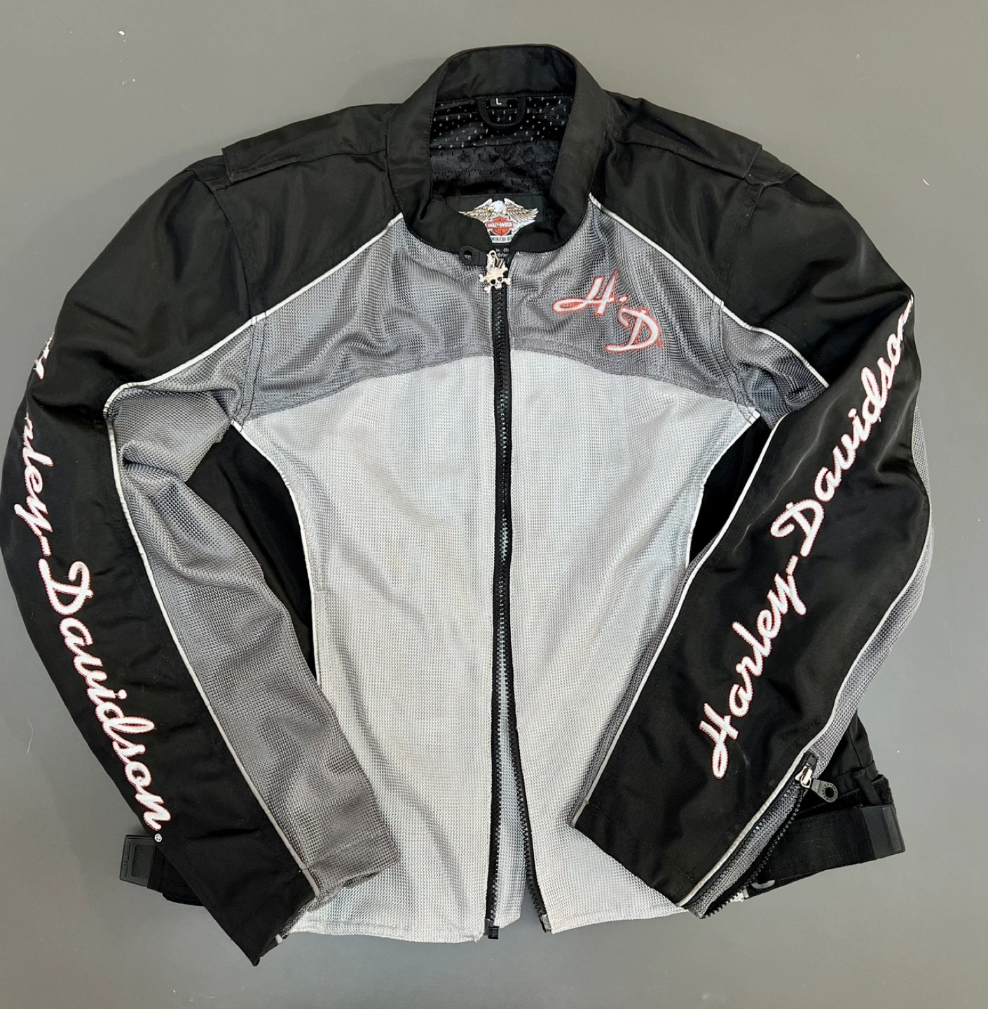 Spring is on its way!! Think warm & safe EUC Ladies Mesh Motorcycle Jacket- with nylon windbreaker insert. Size Large- however fits like a medium Breathable Mesh Material - jacket is made from a sturdy mesh material that allows for excellent airflow, keeping you cool during warm weather rides- removable windbreaker helps on the cooler days Reflective Details - reflective elements for enhanced visibility and safety during night rides. Adjustable Fit- jacket has adjustable Velcro on the waist to ensure a comfortable and secure fit. **Velcro super clean shows little use.** Has elbow and shoulder inserts for xtra protection Multiple Pockets -zippered pockets, including two inside pockets and two outside pockets, providing ample storage for your essentials. Full Zip Front Zip -jacket features a full zip front for easy on and off Small knick right cuff - does not impair function or safety We are located in Oakville on Third Line, South of QEW and North of Lakeshore Thank you for looking and please check out our other items