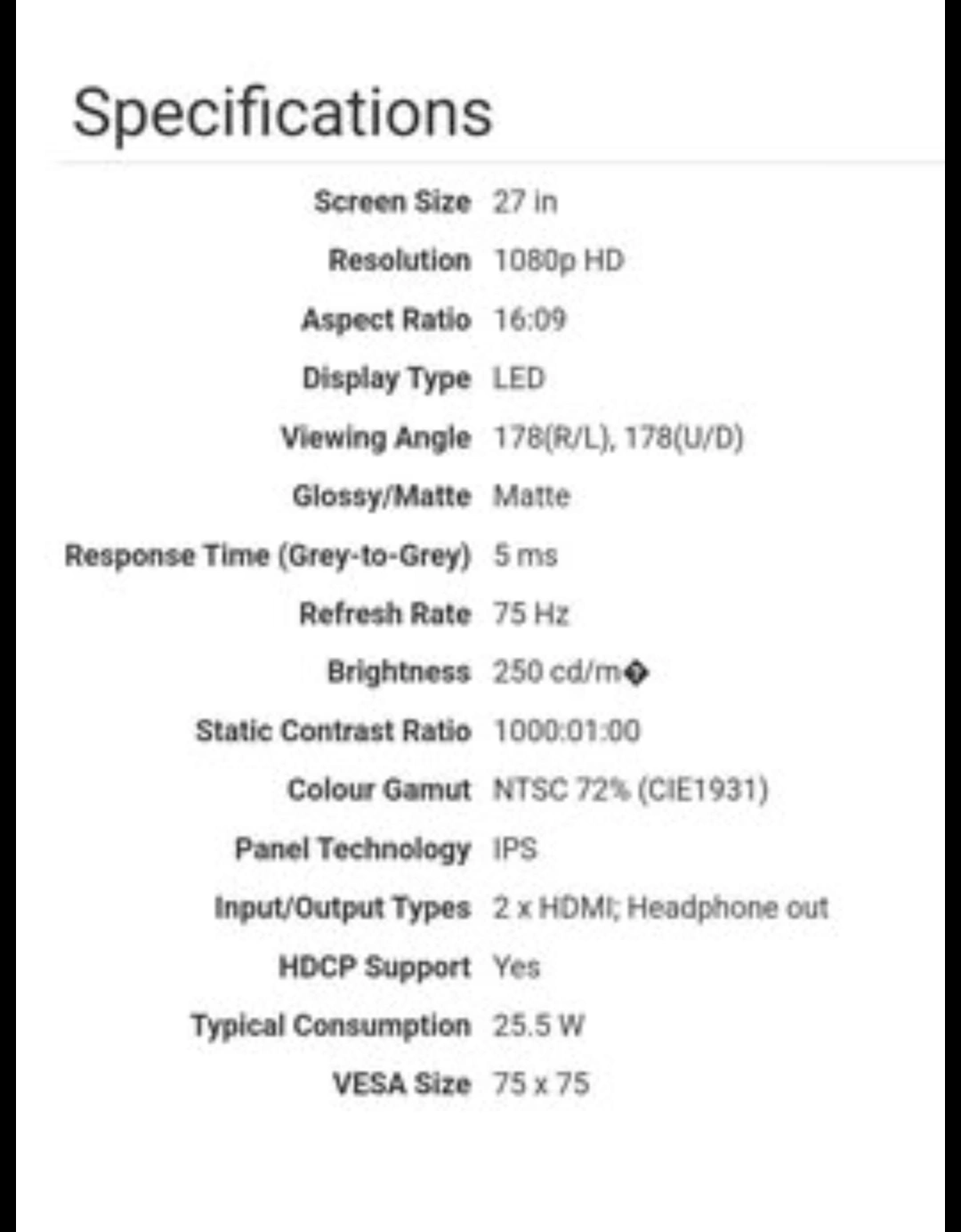 125Selling an LG 27-inch LED monitor. It has a 1080p HD resolution and a matte display type. Key specs include: - Aspect Ratio: 16:09 - Viewing Angle: 178(R/L), 178(U/D) - Response Time: 5ms - Refresh Rate: 75Hz - Static Contrast Ratio: 1000:01:00 - VESA Size: 75 x 75