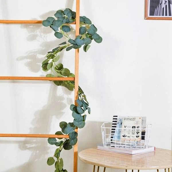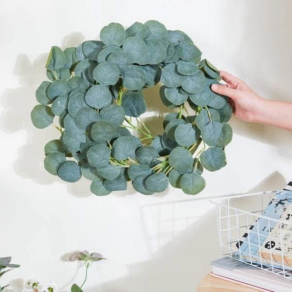 The artificial leaf vine has been crafted with expertise to provide a touch of nature to one's home. The circular variegated leaves with their patterns look realistic and are adorned on a PVC stem that can be bent and decorated as per one's wish. The artificial eucalyptus leaf vine is ideal for decorating bookshelves, cabinets, and vases. The artificial leaf vine may also be used to decorate the dining table or may be hung on the wall as a wall decor piece. Properties: - Looks natural & realistic - Can be hung on walls, doors, swings, mirrors - Suitable for party decoration - Easy to maintain - Will not fade Nestip: Use the leaf vine surrounding a photo frame to create an exquisite decor. Size: 180cm L Colour: Green Material: PVC, ribbon Products included: 6ft vine x 3 pieces