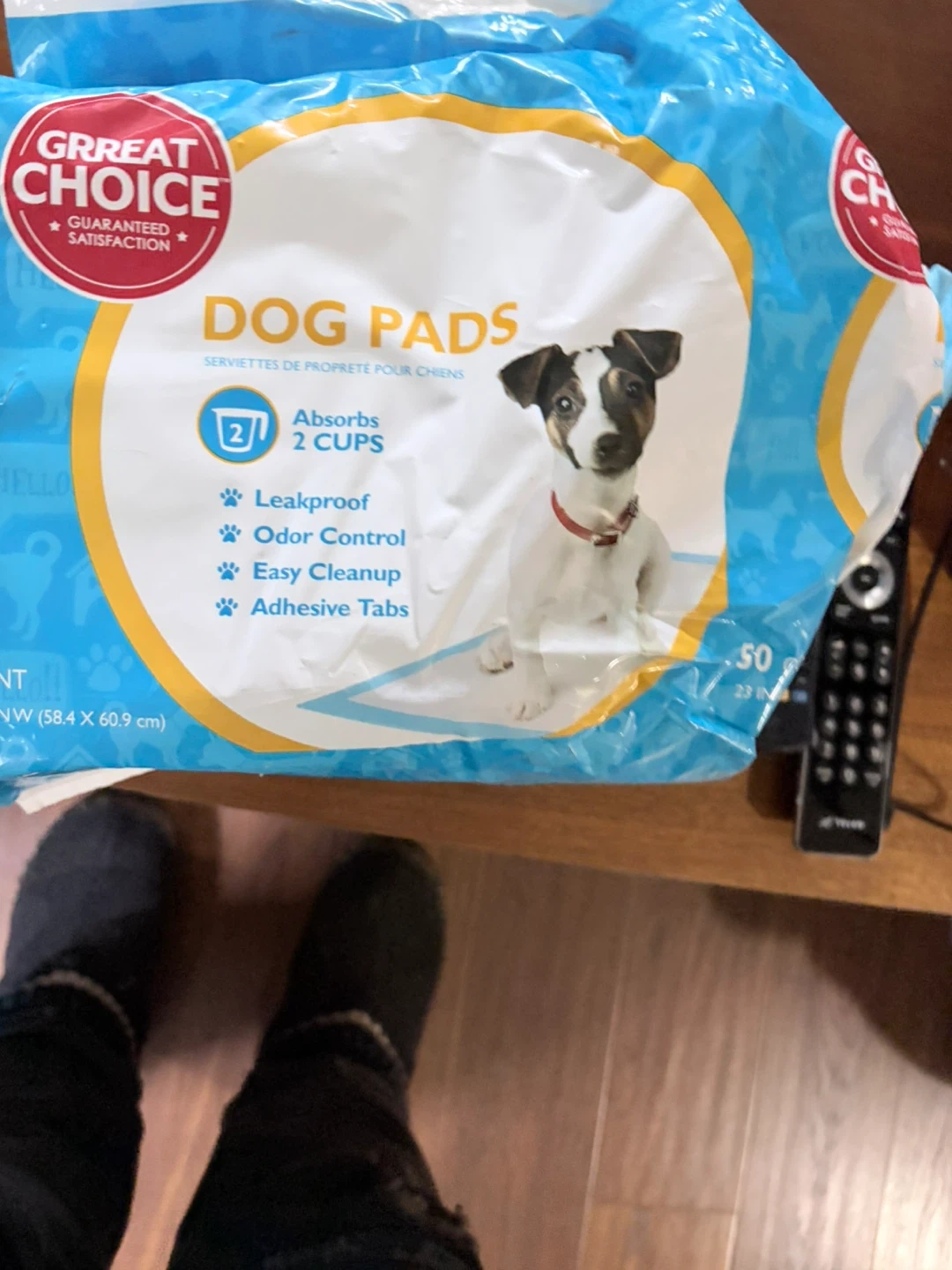 Great Choice dog pads designed for leakproof protection and odor control. They absorb up to 2 cups and feature adhesive tabs for easy placement. Cleanup is a breeze with these pads! Open bag but barely used lots of pads left