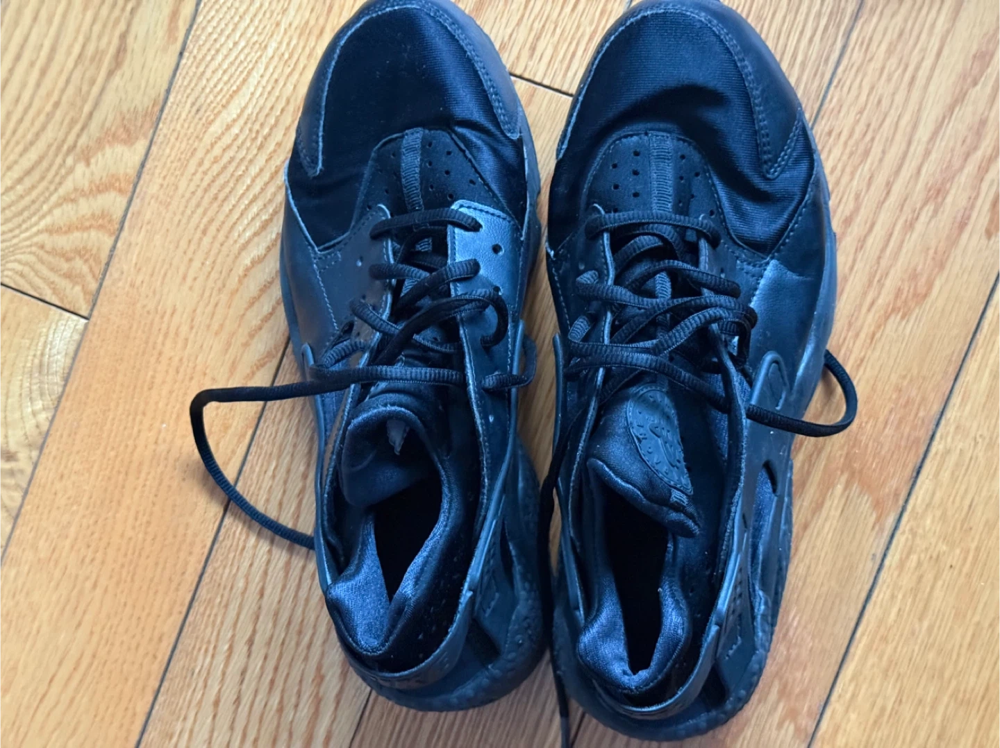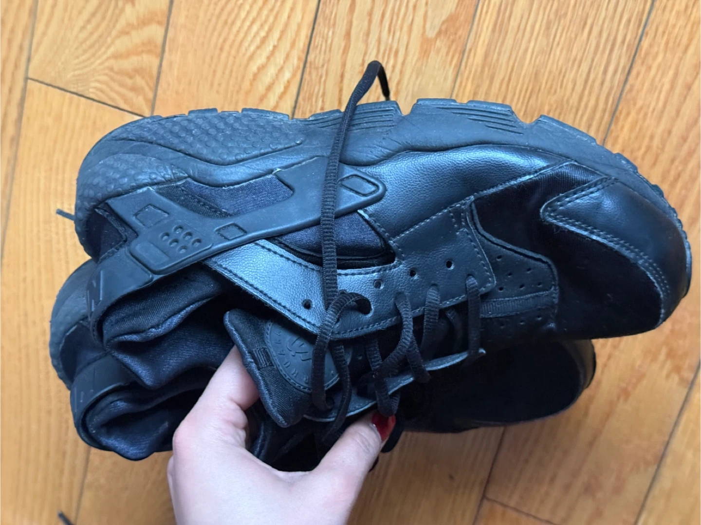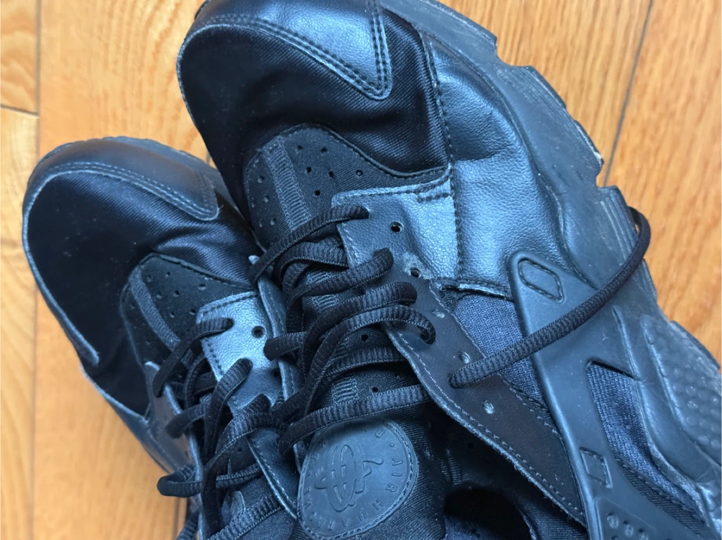 Black Nike Air Huarache sneakers. These shoes are made with a mix of leather and synthetic materials. They feature the classic Huarache strap design and Nike Air cushioning.