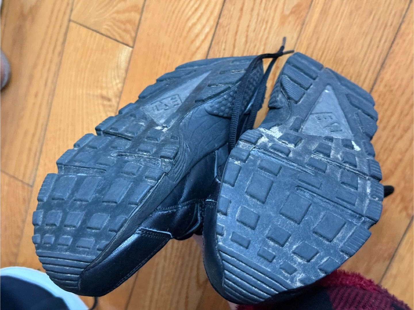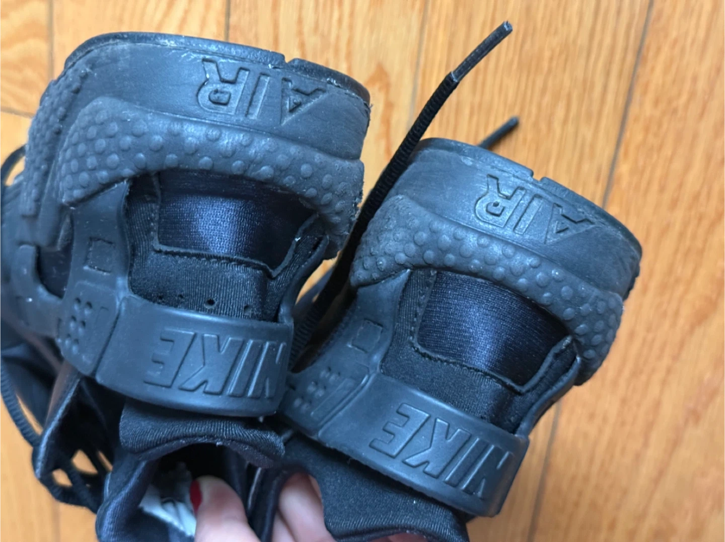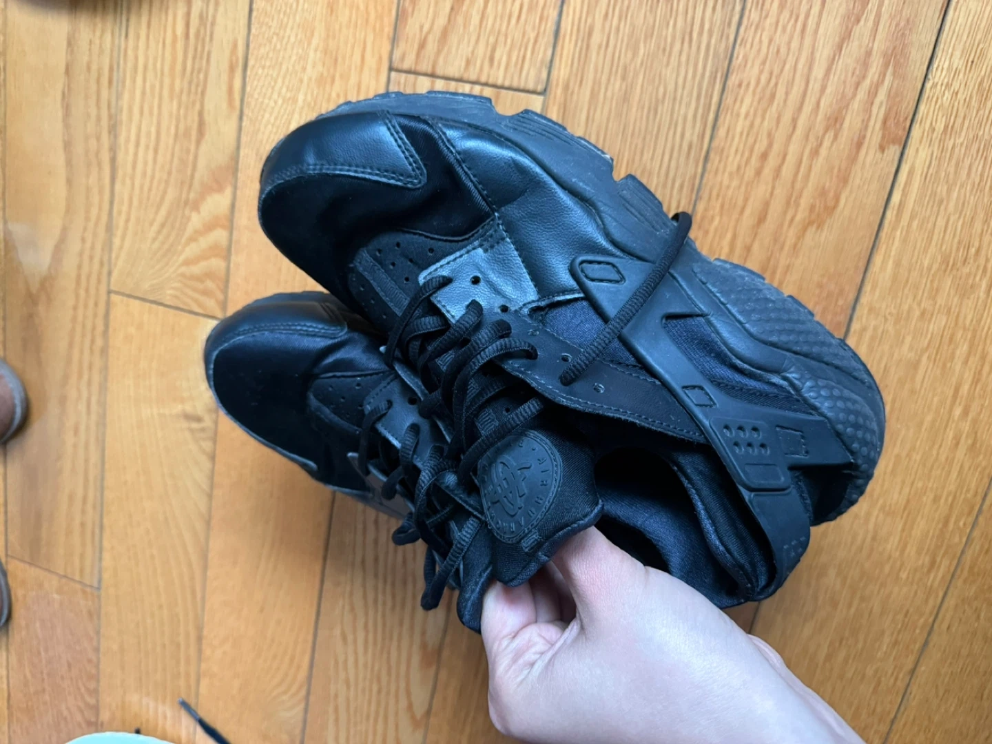 Black Nike Air Huarache sneakers. These shoes are made with a mix of leather and synthetic materials. They feature the classic Huarache strap design and Nike Air cushioning.