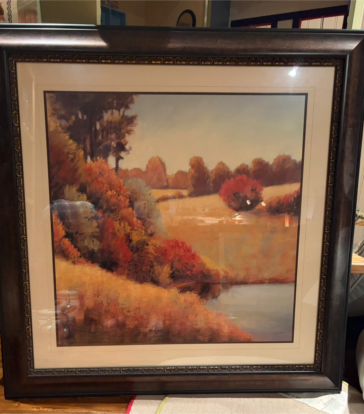 This framed painting depicts an autumn landscape scene with a body of water and trees. It's housed in a dark, ornate frame with a decorative mat. Have another similar listed, buy both for $100!