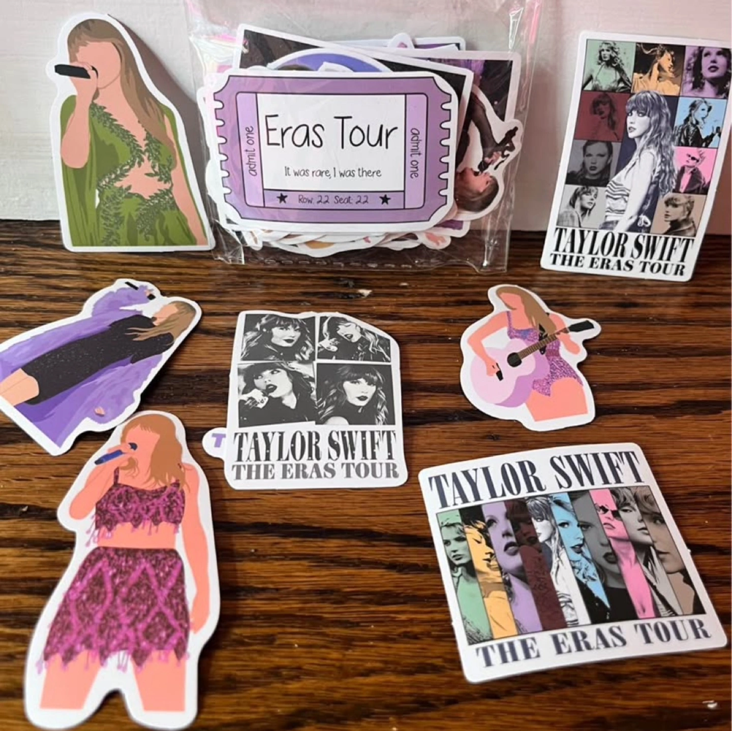 Various Taylor Swift Eras Tour stickers. Includes individual stickers of Taylor in different outfits, a collage sticker, and a ticket-style sticker. Great for decorating laptops, water bottles, or journals.