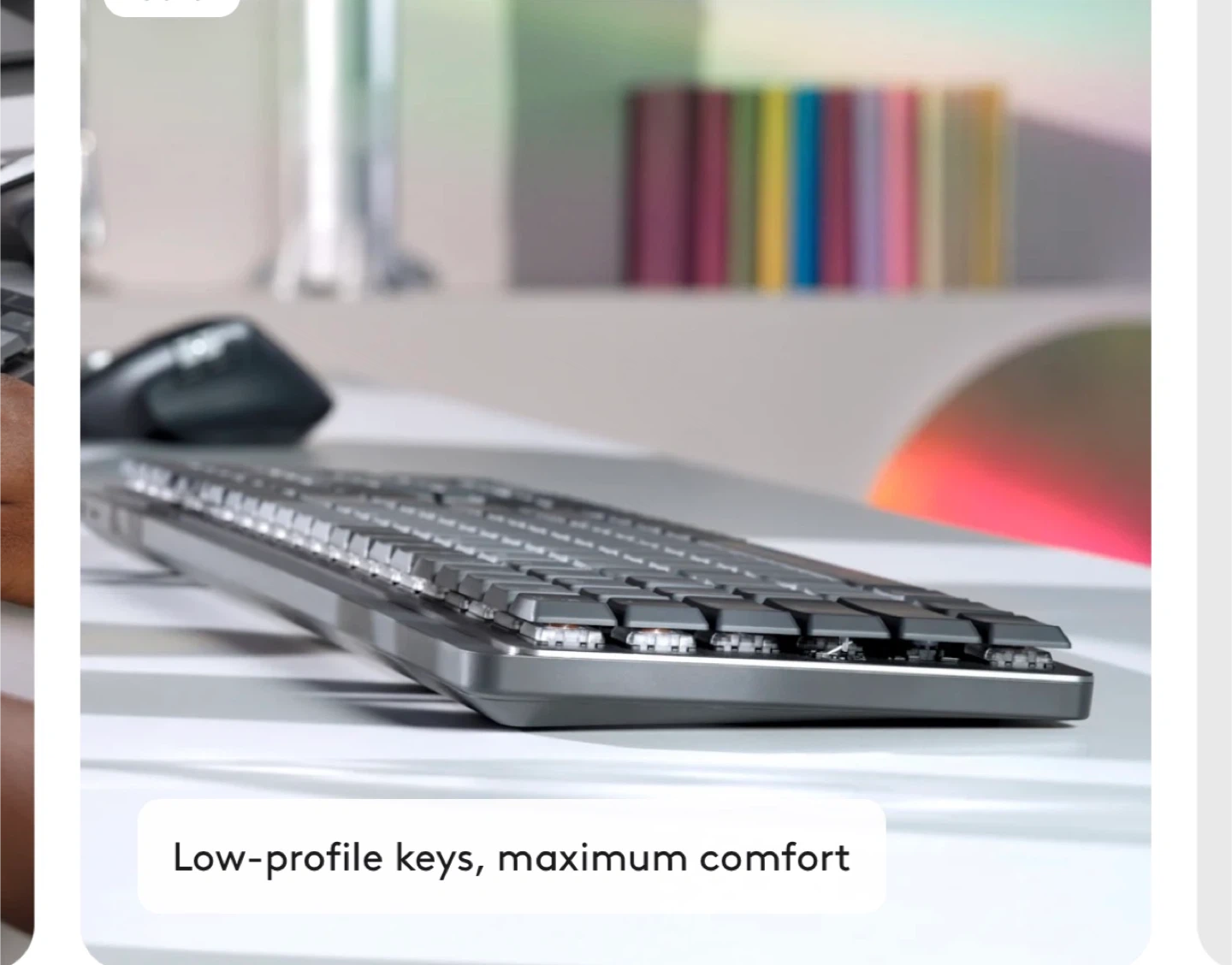 Selling a Logitech MX Mechanical Keyboard. It features tactile quiet keys for a comfortable typing experience. The keyboard is made with recycled plastic, contributing to sustainability. Enjoy low-profile keys for maximum comfort while you work or play.