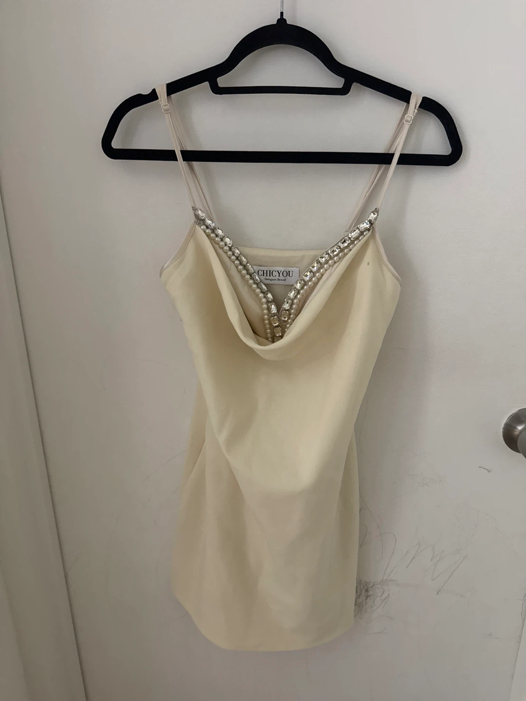 Cream slip dress from CHICYOU. It has adjustable spaghetti straps and a V-neckline adorned with rhinestones and pearls. The dress features a satin lining.