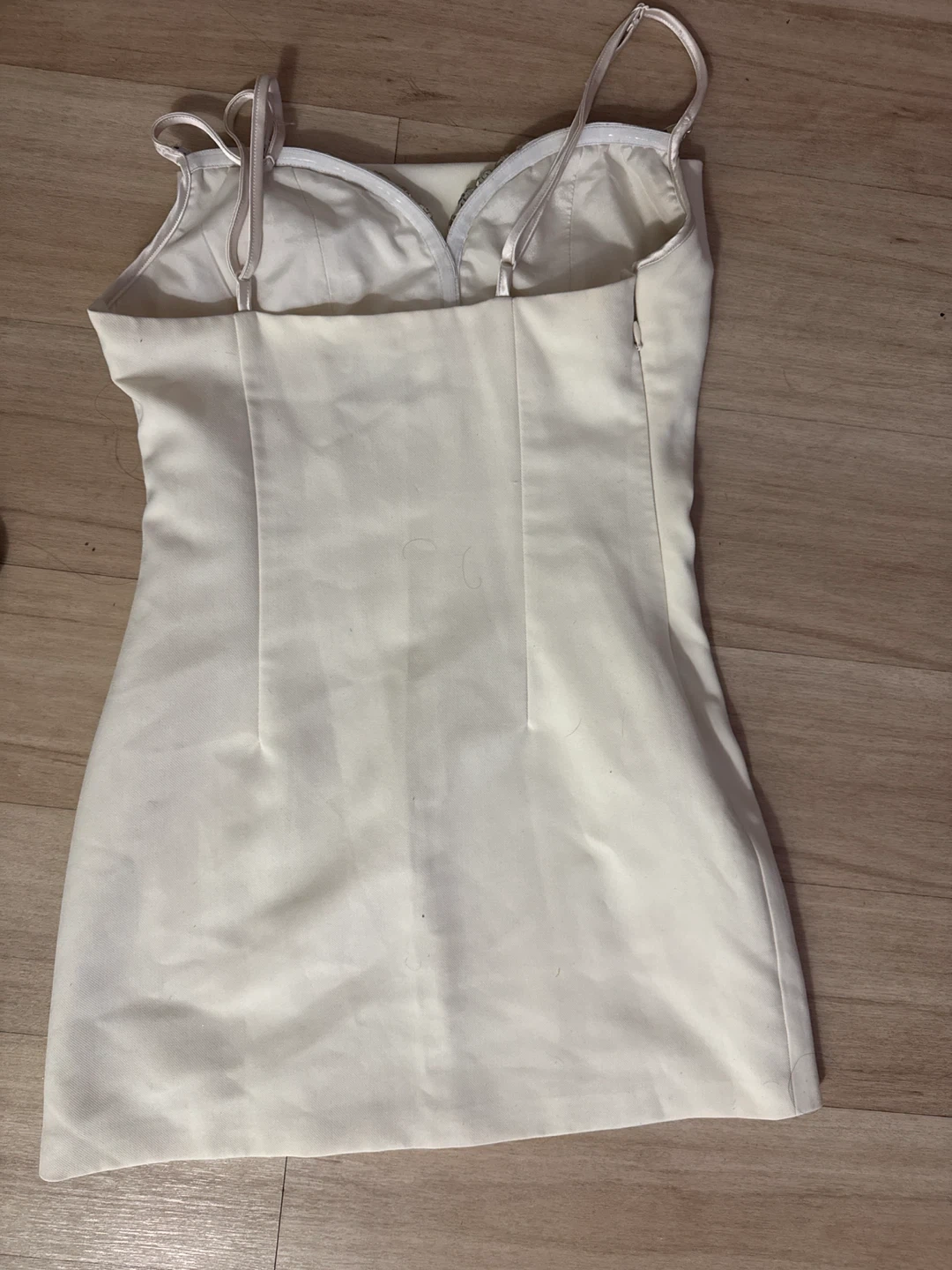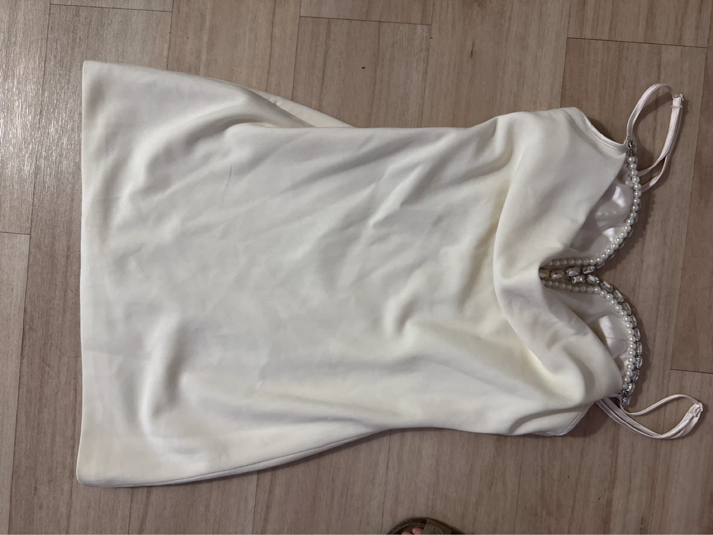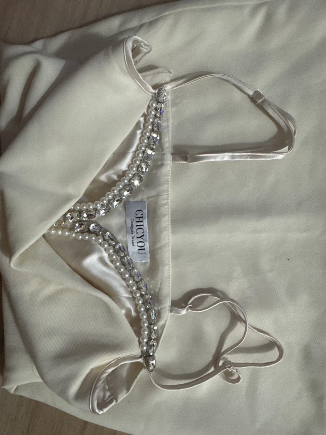 Cream slip dress from CHICYOU. It has adjustable spaghetti straps and a V-neckline adorned with rhinestones and pearls. The dress features a satin lining.