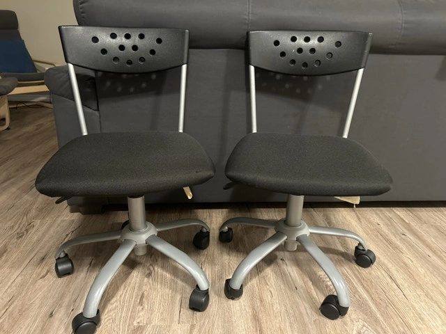 Selling a pair of used IKEA office chairs, perfect for a home office or student workspace. They feature adjustable height and a comfortable seat. These chairs are in excellent condition and roll smoothly. Cash accepted.